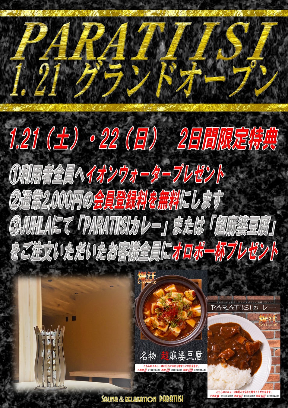 ・JUHLAにて「PARATIISIカレー」または「超麻婆豆腐」をご注文いただいたお客様全員にオロポ一杯プレゼントします。