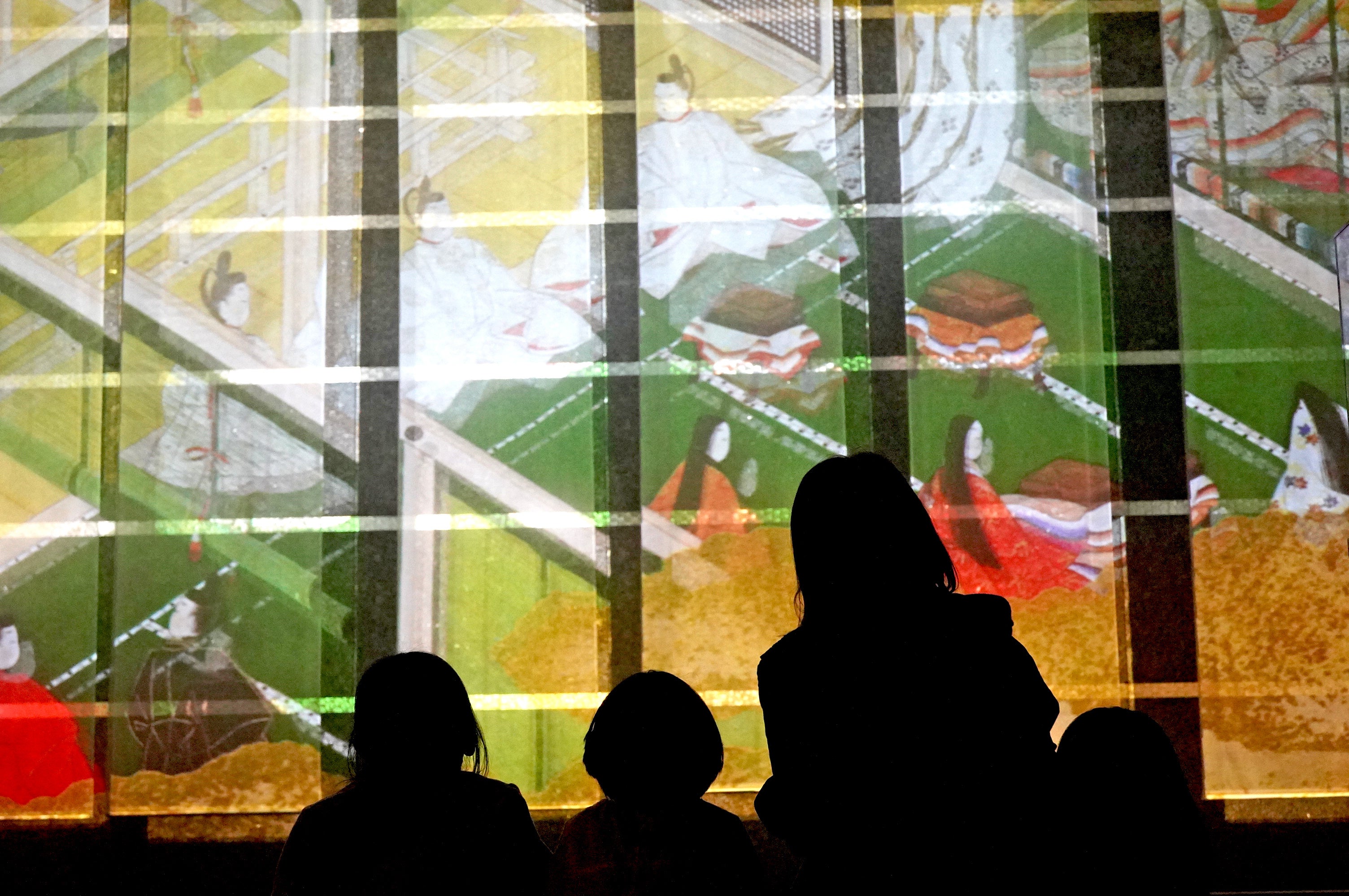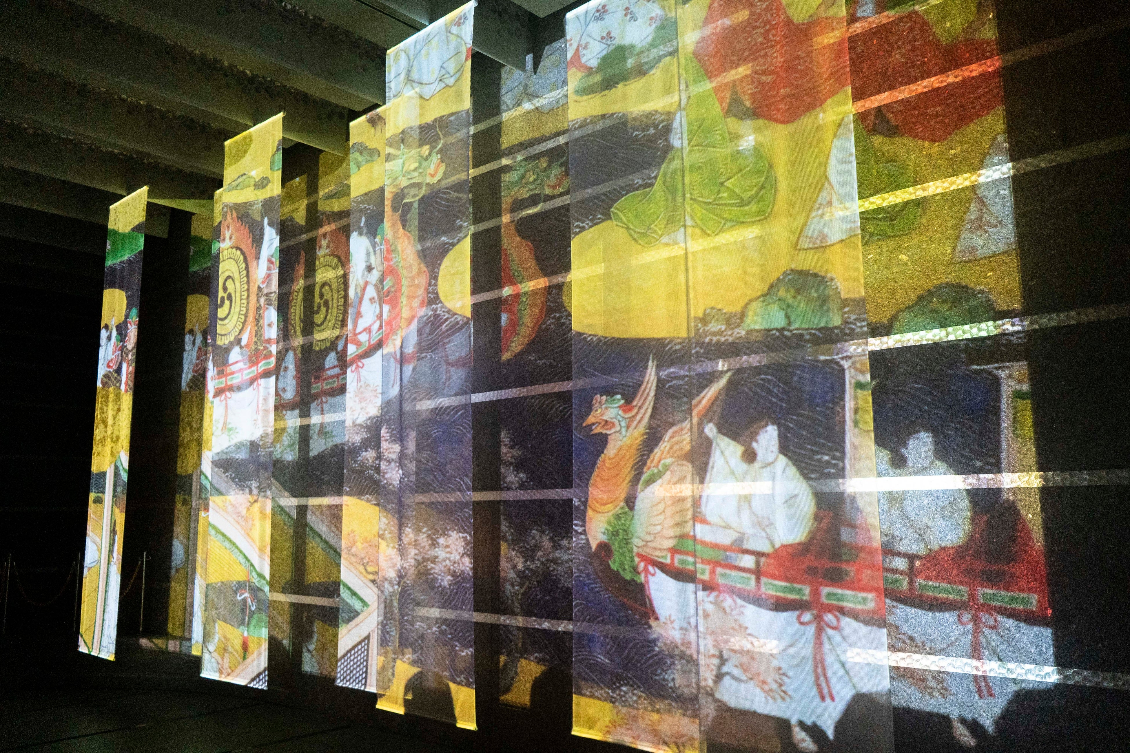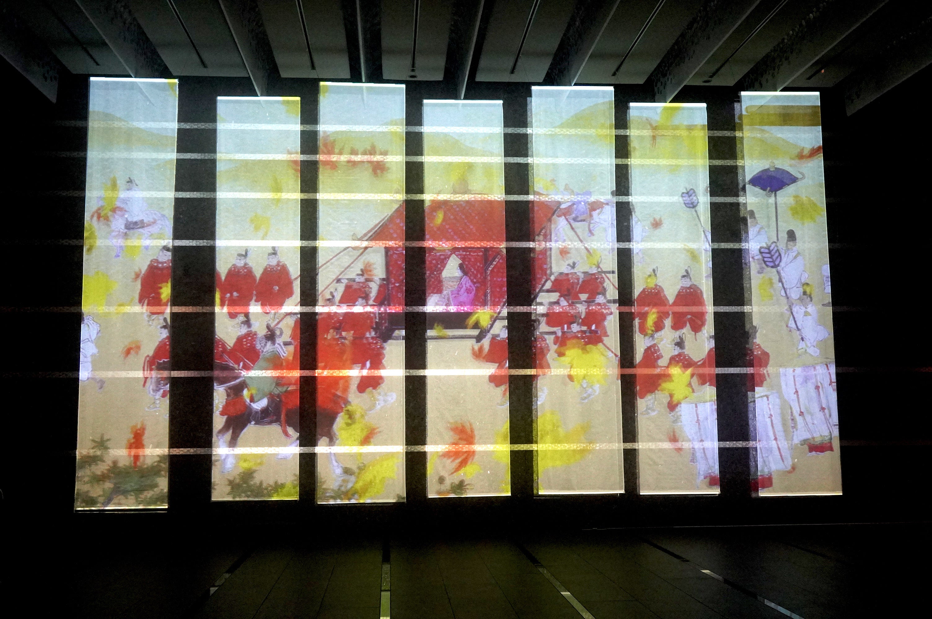 斎宮歴史博物館のエントランスホールに博物館が所蔵する「伊勢物語図屏風」や「斎王群行絵巻」などをモチーフにしたデジタルアート作品を展示しました。