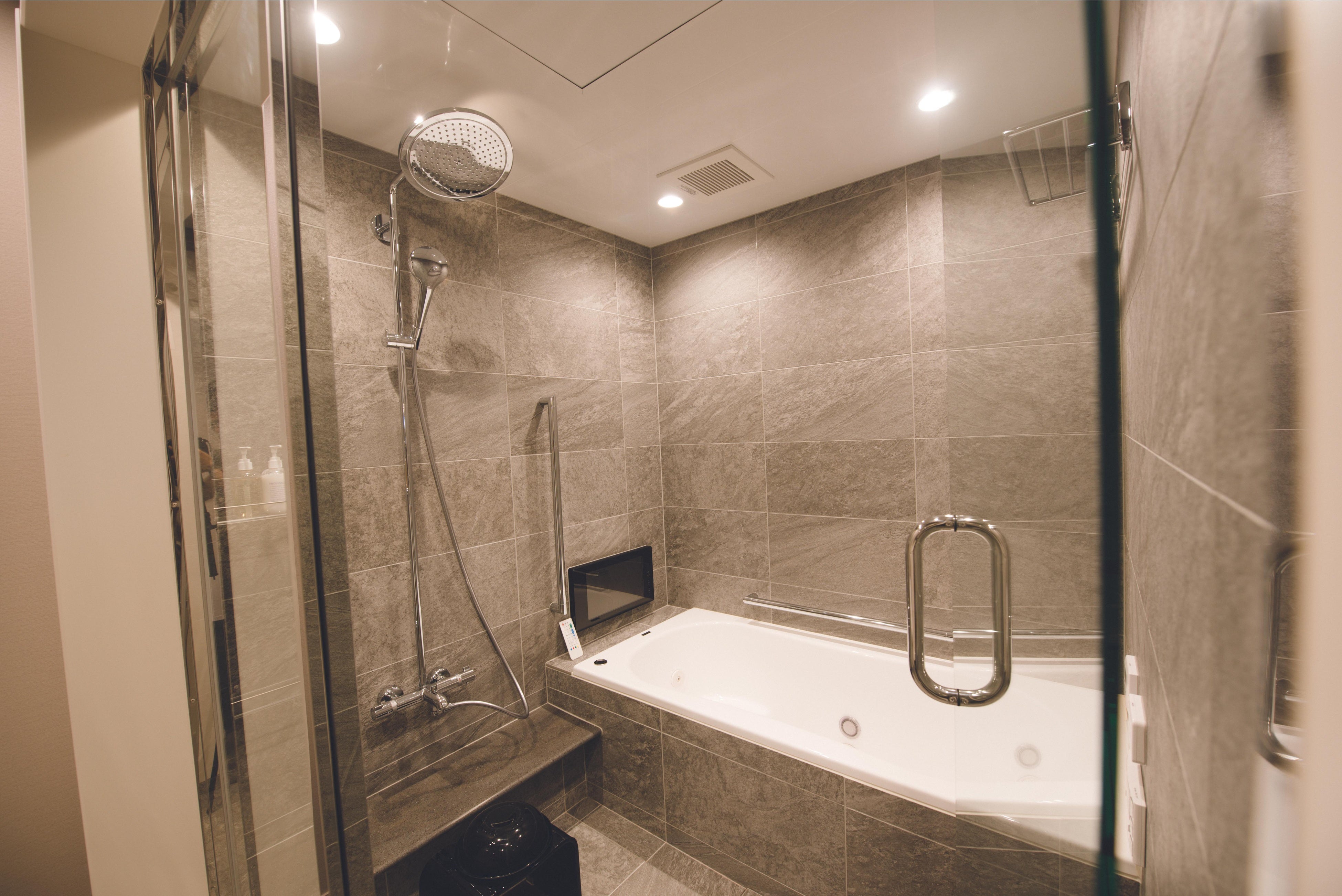 大会終了後、すぐに浴室利用やお着替えが出来るよう、スタッフがお風呂の用意いたします。水風呂等のご要望もお気軽にお申し付けください。(写真はスイートルーム浴室)