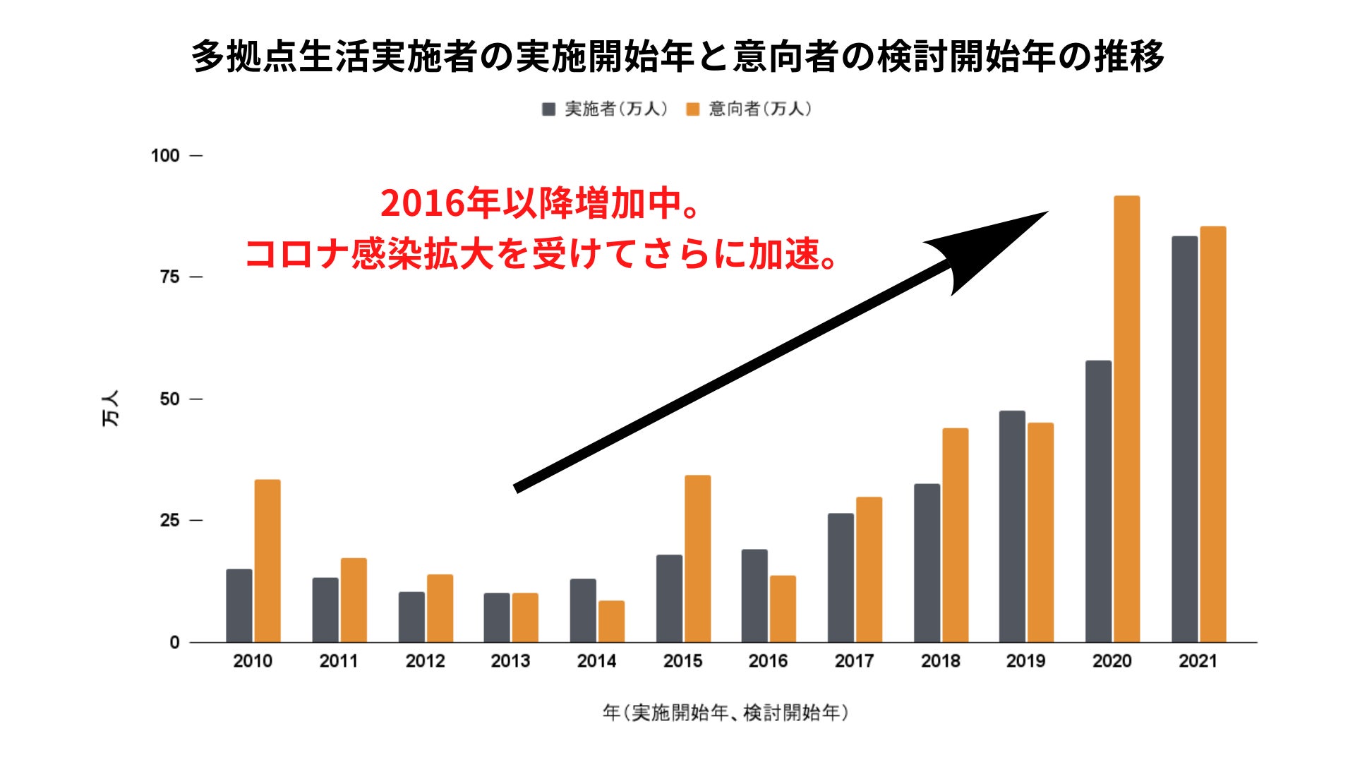 二拠点生活というライフスタイルは近年注目を集めています。旧来は、二拠点生活は富裕層や退職後など経済的・時間的に余裕がある人だけが選択できるライフスタイルだったのが、リモートワークの普及や二拠点生活を実現するサービスの増加により、幅広いが層が選択できるライフスタイルになりつつあります。国土交通省も日本全体で人口が減少する中での地域振興の施策として二拠点生活というライフスタイルを推進しており、2021年3月には「全国二地域居住等促進協議会」を設立しています。そして、このトレンドはコロナ感染拡大を背景に加速しており、実際に二拠点生活の実施者、意向者が2020年以降に急速に増加しています。