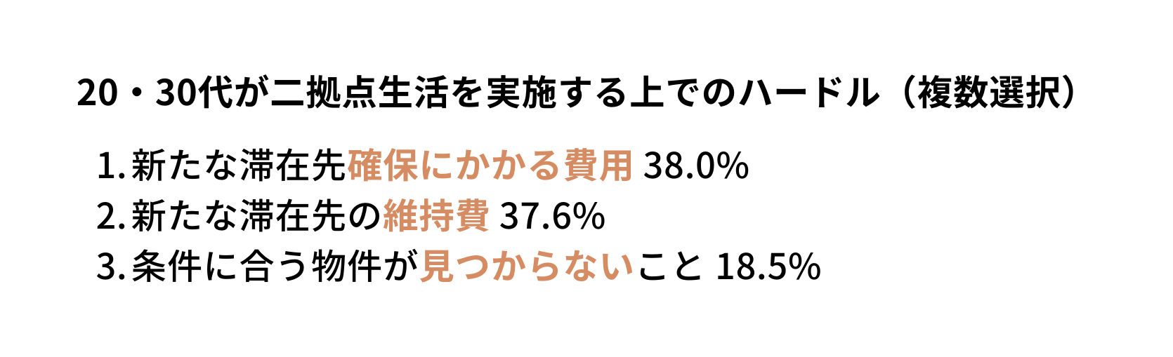 そして、20・30代が二拠点生活を希望しつつも実施できていないのは「初期費用」「維持費用」「物件調達」の3つが大きなハードルになっているからです。仕事をしながら子育てに励む世代は経済的な余裕・時間的な余裕がなくて二拠点生活を断念してしまうことが想像されます。