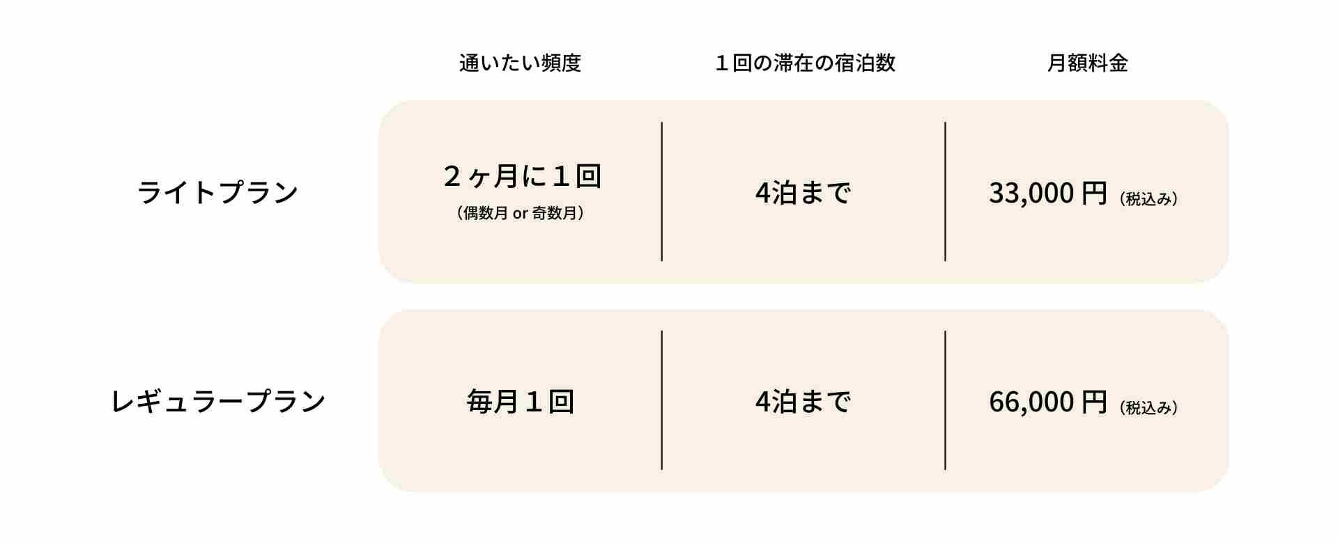 ライトプランは1か月おきに1回通うことができるプランです。スタンダードプランは毎月に1回通うことができるプランです。どちらのプランも1回の滞在で最大で4泊まで宿泊することができます。