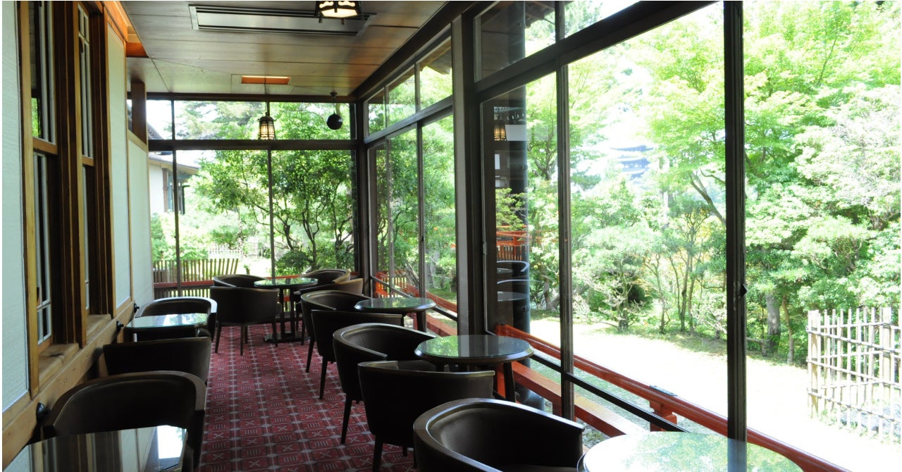 天井まで届く窓から、四季折々の風景や古都の景観を楽しむことができます。芳しいコーヒー、こだわりの紅茶とともにゆっくりとお寛ぎください。