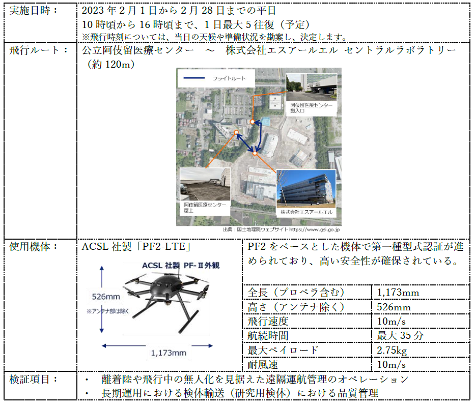 レベル4飛行でのドローン運用を想定し、2023年2月の平日日中帯に、遠隔地からの運航管理による飛行業務を行います。公立医療センター(所在地:東京都あきる野市引田78番地1)と株式会社エスアールエル セントラルラボラトリー(所在地:東京都あきる野市渕上50)の間で飛行ルートを設定し、物流用ドローンの自律飛行による医療物資輸送を行います。