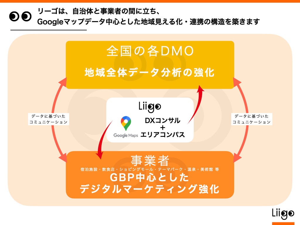 弊社は、これまで旅行予約サイト「Liigo(リーゴ)」を運営するスタートアップでしたが、新型コロナウイルス流行の影響を強く受けて以降、一時は会社存続の危機に陥りました。旅行市場全体も大きな変化に直面する中、新たなチャンスとしてGoogleマップ(ビジネスプロフィール)の可能性を見出し、自治体や観光事業者向けにGoogleマップ(ビジネスプロフィール)活用を提案・推進し、再起と急成長を果たしてきています。現在、全国を対象に、約30自治体でプロジェクトを推進中で、数千店舗の観光事業者の支援をしています。また、Googleマップ(ビジネスプロフィール)データを活用し、自治体や観光事業者が地域の見える化や連携を実現できるプラットフォーム「エリアコンパス」を開発。限定約10自治体へβ版を提供し、ユーザーヒアリングを行ってきました。この度、コア機能が揃ったことから「エリアコンパス」を正式リリースいたします。