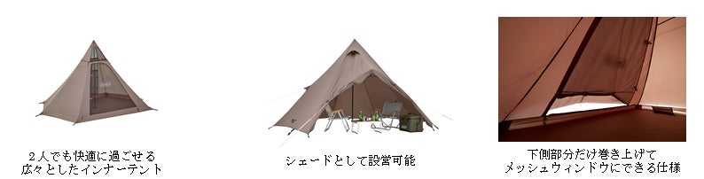 リサイクルポリエステル生地を使用した、コンパクトサイズのティピー型テントです。コンパクトながらフロアサイズ230cm×325cmと2人でも快適に過ごせます。前室もフロントポールを採用することで、降雨時にも出入りがしやすい快適な前室スペースを実現しています。フライシート上部にはベンチレーション、インナーテント下部には巻き上げてメッシュウィンドウにできる仕様にすることによって効率的な空気循環が可能です。インナーテントを外して、シェードとして設営可能なためデイキャンプでも活躍します。