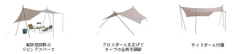 リサイクルポリエステル生地を使用したファミリーサイズのヘキサタープです。約460×435とサイズが大きくファミリーが快適に過ごせるリビングスペースを提供します。メインのクロスポールとサイドポールを組み合わせることで、自分のスタイルに合わせた形にアレンジ可能です。テントとセットアップで使用することで、快適な居住空間を実現します。