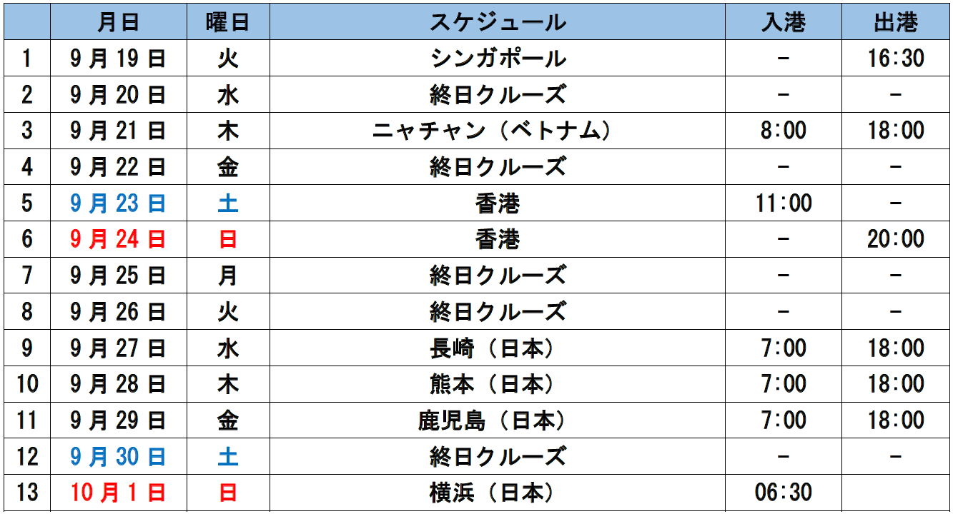 ①2023/9/19出航 日本・ベトナム・香港周遊クルーズ12泊13日