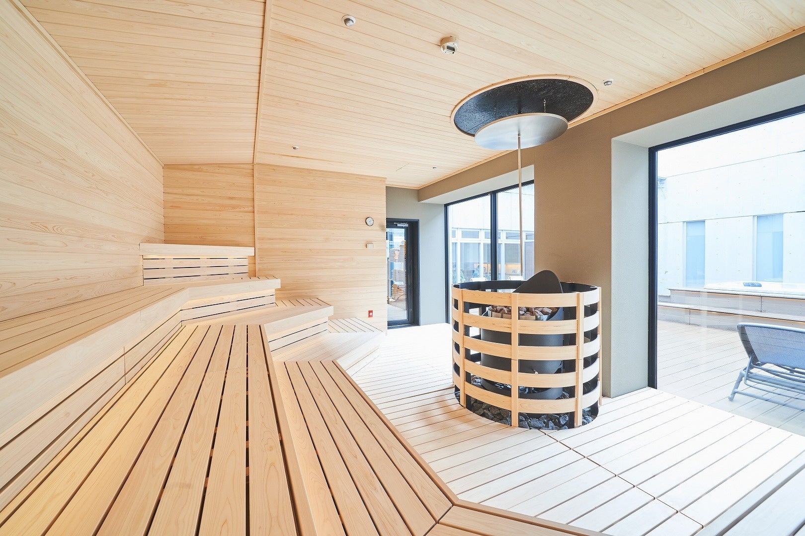おふろcafé yusaのサウナガーデンは、収容人数30人以上、男女で一緒に楽しむことができる山形最大級の大型サウナ室です。ストーブはドイツから海を渡ってきたサウナストーブ EOS Zeus/Zeus L を採用。サウナストーンに水をかけて水蒸気を発生させて発汗を促進させる、セルフロウリュもお楽しみいただけます。