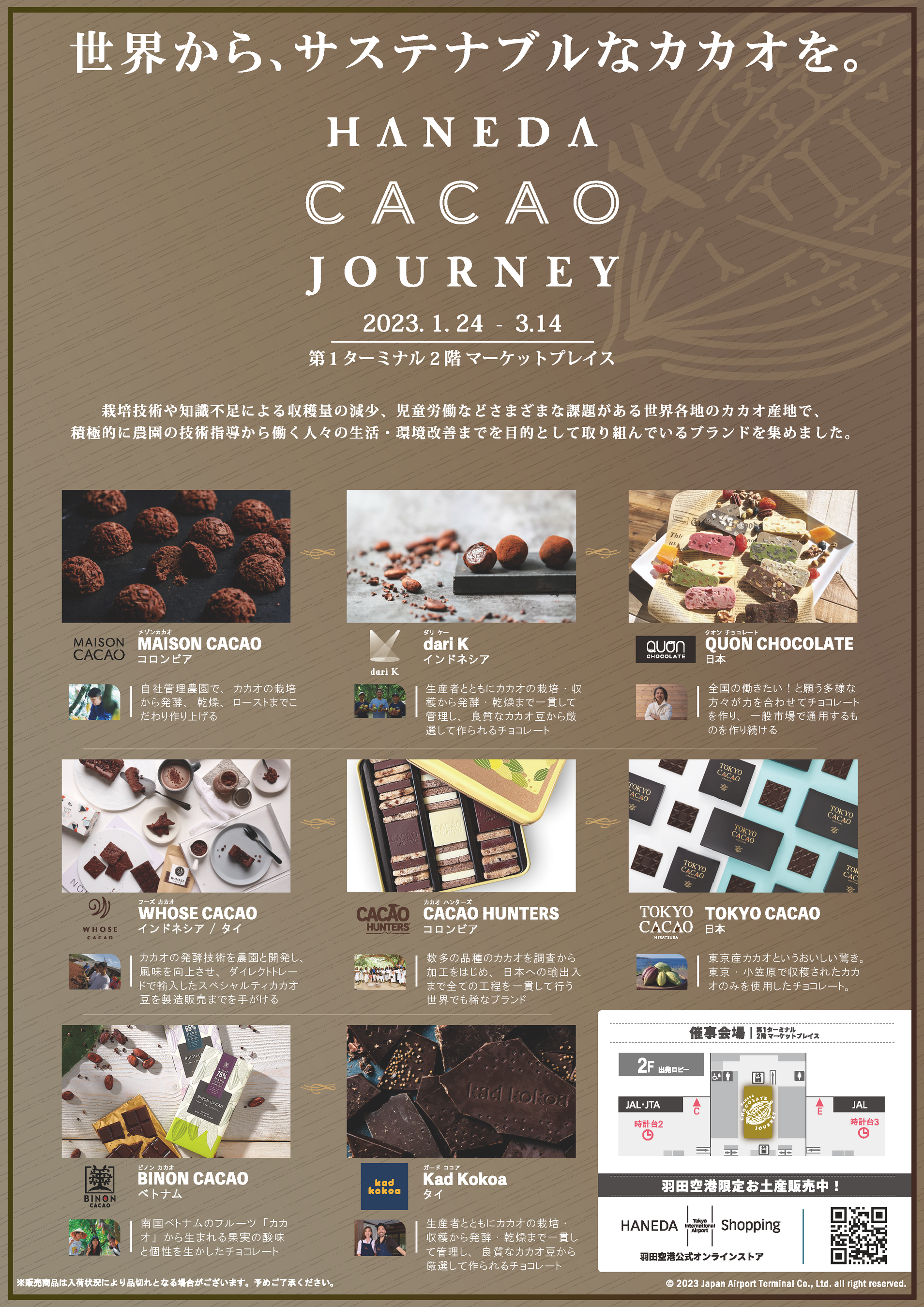 また、今年はチョコレートの祭典に加え、サステナブルの観点から、世界各地のカカオ産地が抱えているさまざまな課題に対し、フェアトレードや農園支援で改善・ 解決に取り組んでいるブランドのチョコレートを集めた「HANEDA CACAO JOURNEY」をあわせて展開しますので、是非お越しください。