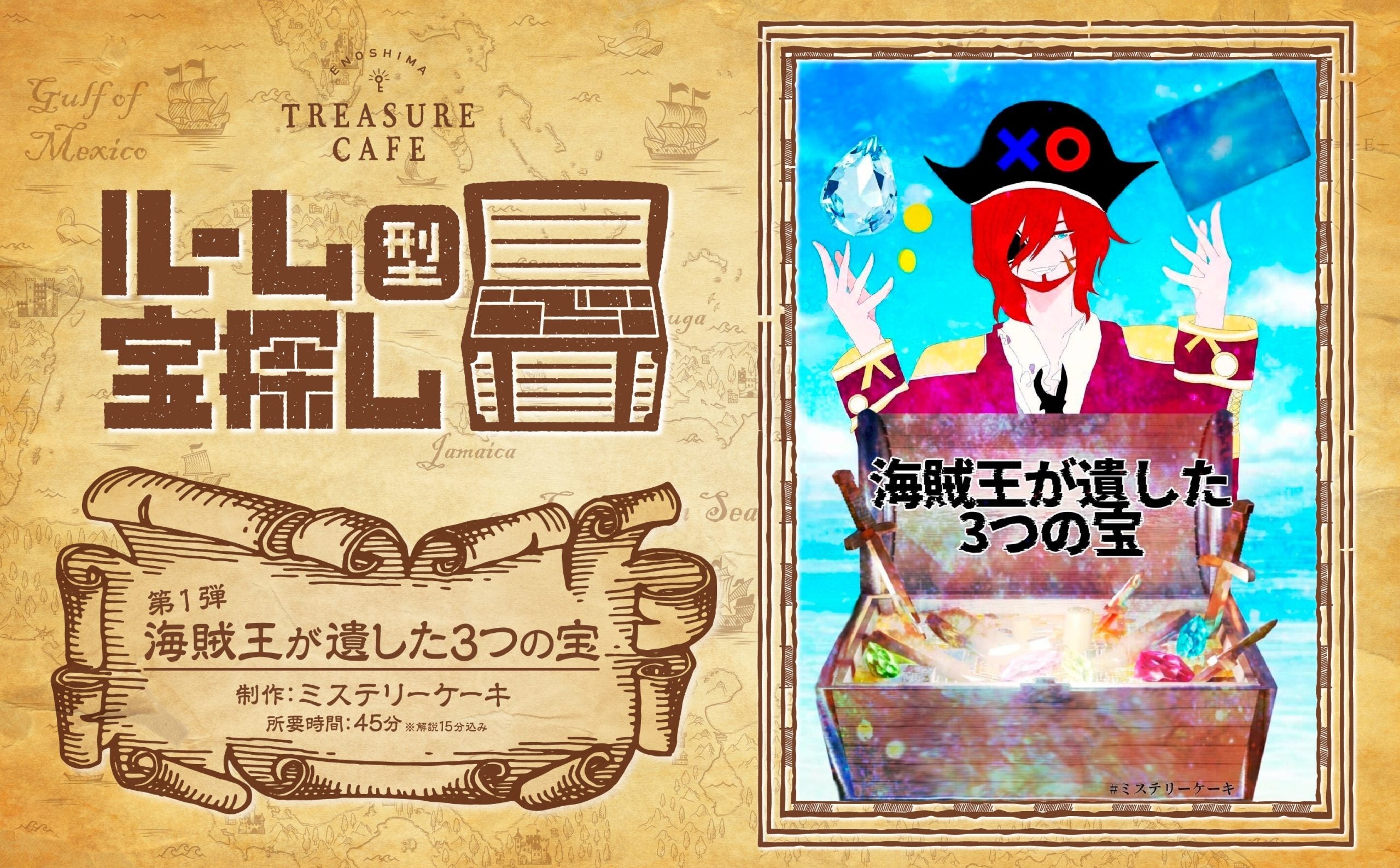 「ENOSHIMA TREASURE CAFE」初となるルーム型宝探し第1弾。CAFEのVIPルームで「海賊王が遺した3つの宝」を探し出す、リアル宝探し体験です。