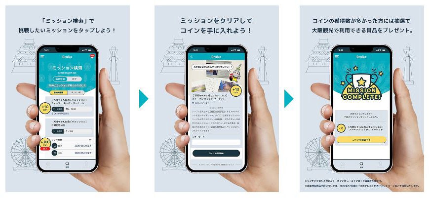 全国から大阪に観光に来ていただき、府内の様々なエリアで周遊を楽しんでいただく「大阪来てな!キャンペーン」の一環として、LINE公式アカウント 『Desika:大阪でしか』を使ったミッションイベントを実施しています。本企画は、『Desika:大阪でしか』を友だち追加して、ミッションに挑戦してコインを手にいれる周遊イベントです。2023年2月28日までに獲得コイン数がランキング上位50位以内の方に、W大阪やOMO7大阪など大阪の人気ホテル宿泊券など豪華賞品が当たるキャンペーンを実施中!