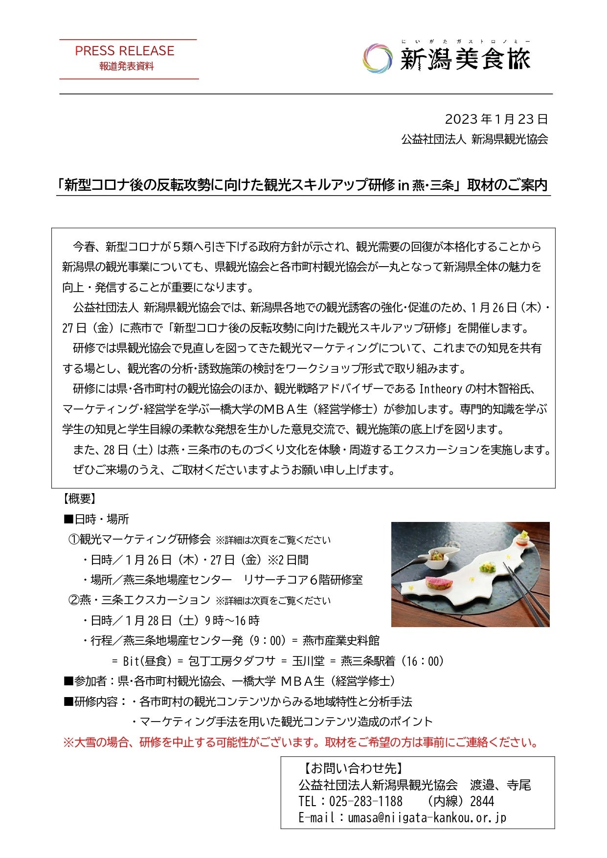1月26日(木)・27日(金)に燕市で「新型コロナ後の反転攻勢に向けた観光スキルアップ研修」を開催します。