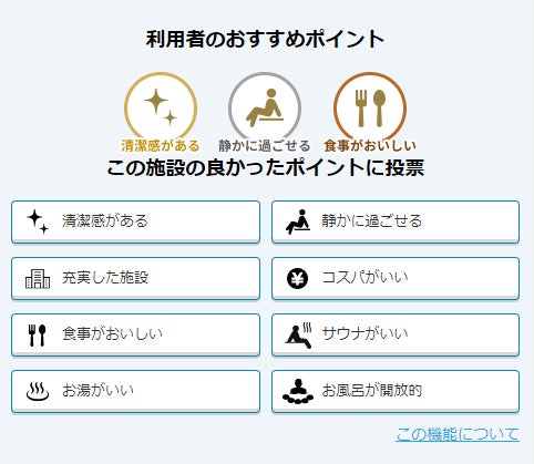 ニフティ温泉では、すべての施設詳細ページに「清潔感がある」「食事がおいしい」「サウナがいい」などのユーザー投票のボタンを設置し、投票が多かった項目上位3件を表示しています。(※投票数が一定数に満たない場合は表示されません)ぜひ施設選びの際に参考にしていただければと思います。