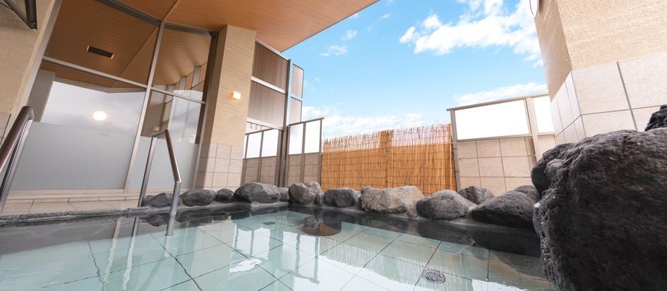 露天風呂と内風呂あわせて8種類のお風呂がラインナップされ、人工のアルカリ性単純温泉や高濃度炭酸泉、高温サウナのほか、エリア初となる水素風呂も用意されています。