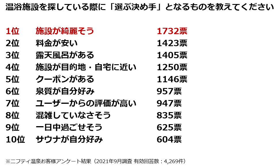 <参考:ニフティ温泉お客様アンケート「温浴施設を探している際に選ぶ決め手となるもの」>