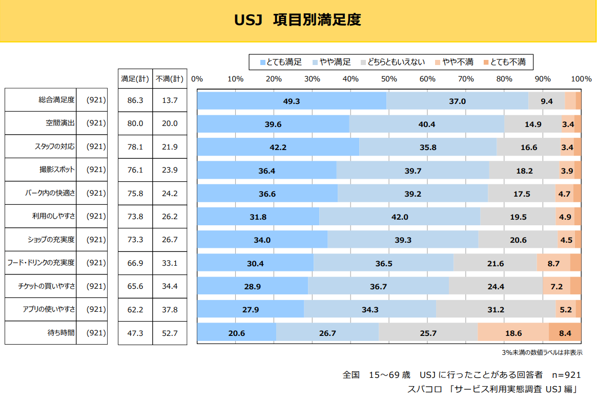 USJ利用者に聞いた満足度項目のうち満足度の高いものでは「空間演出」(80.0%)、「スタッフの対応」(78.1%)、「撮影スポット」(76.1%)。施設のコンテンツでは約8割の利用者が満足しているようです。