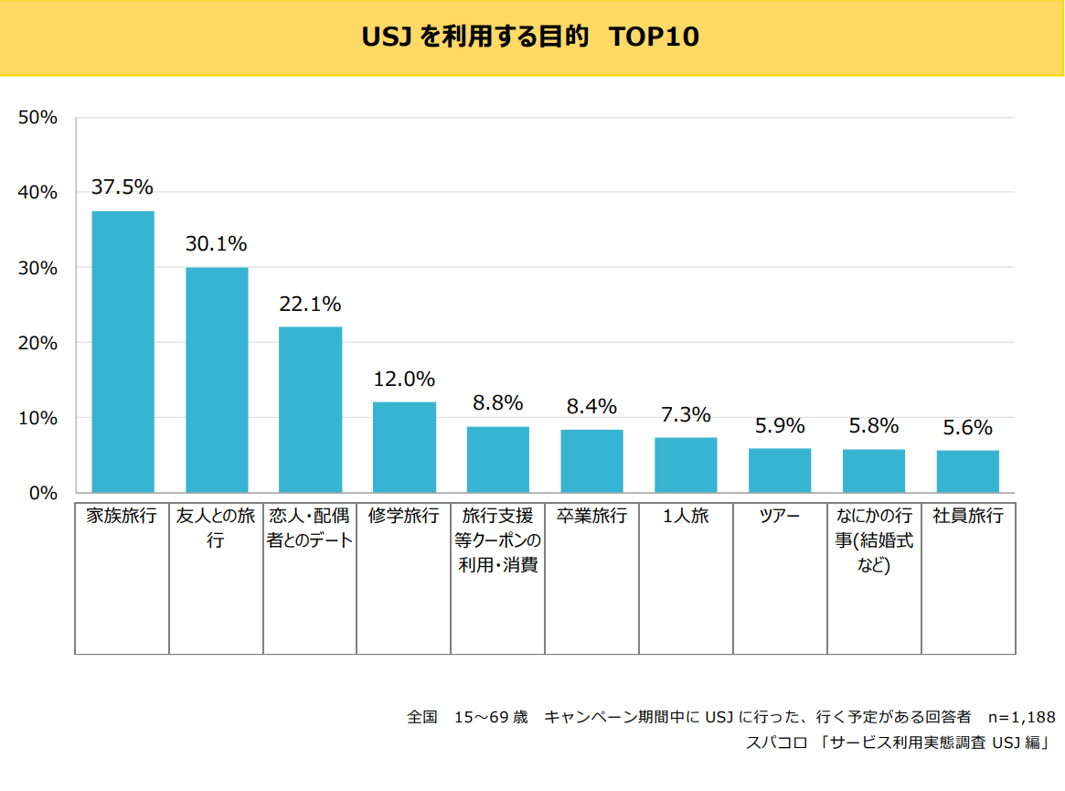 実際のところ利用者及び利用予定者の利用目的はどんなことなのでしょうか?利用目的は上位から「家族旅行」(37.5%)、「友人との旅行」(30.1%)、「恋人・配偶者とのデート」(22.1%)、「修学旅行」(12.0%)が続いています。上位には家族や友人、恋人との旅行目的での利用が挙がっています。