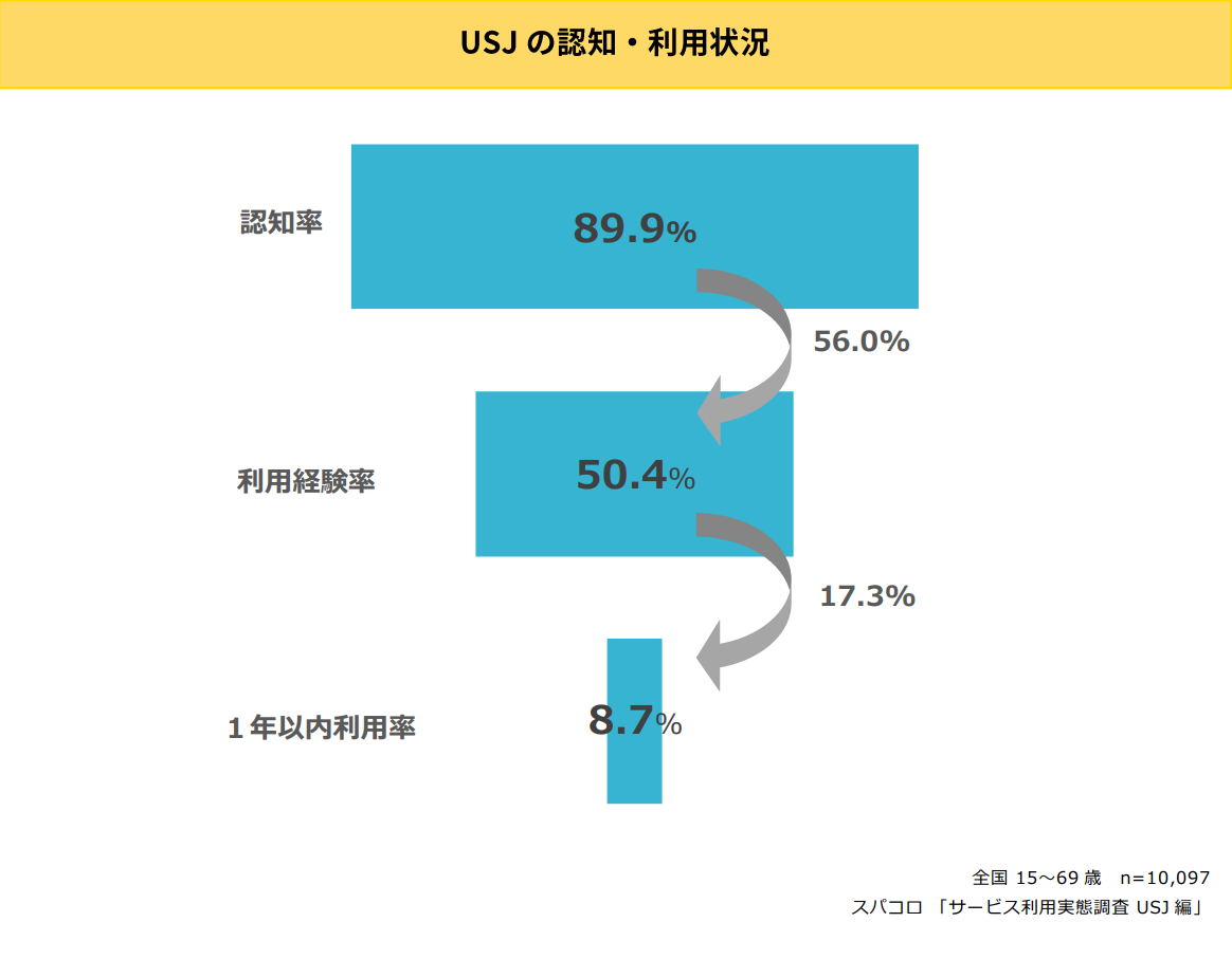 今回はサービスの利用実態調査の一例として、USJについて調査を実施しました。調査結果からは全国で約9割が認知、約半数に利用経験があり、約1割が直近1年以内に利用していることがわかりました。