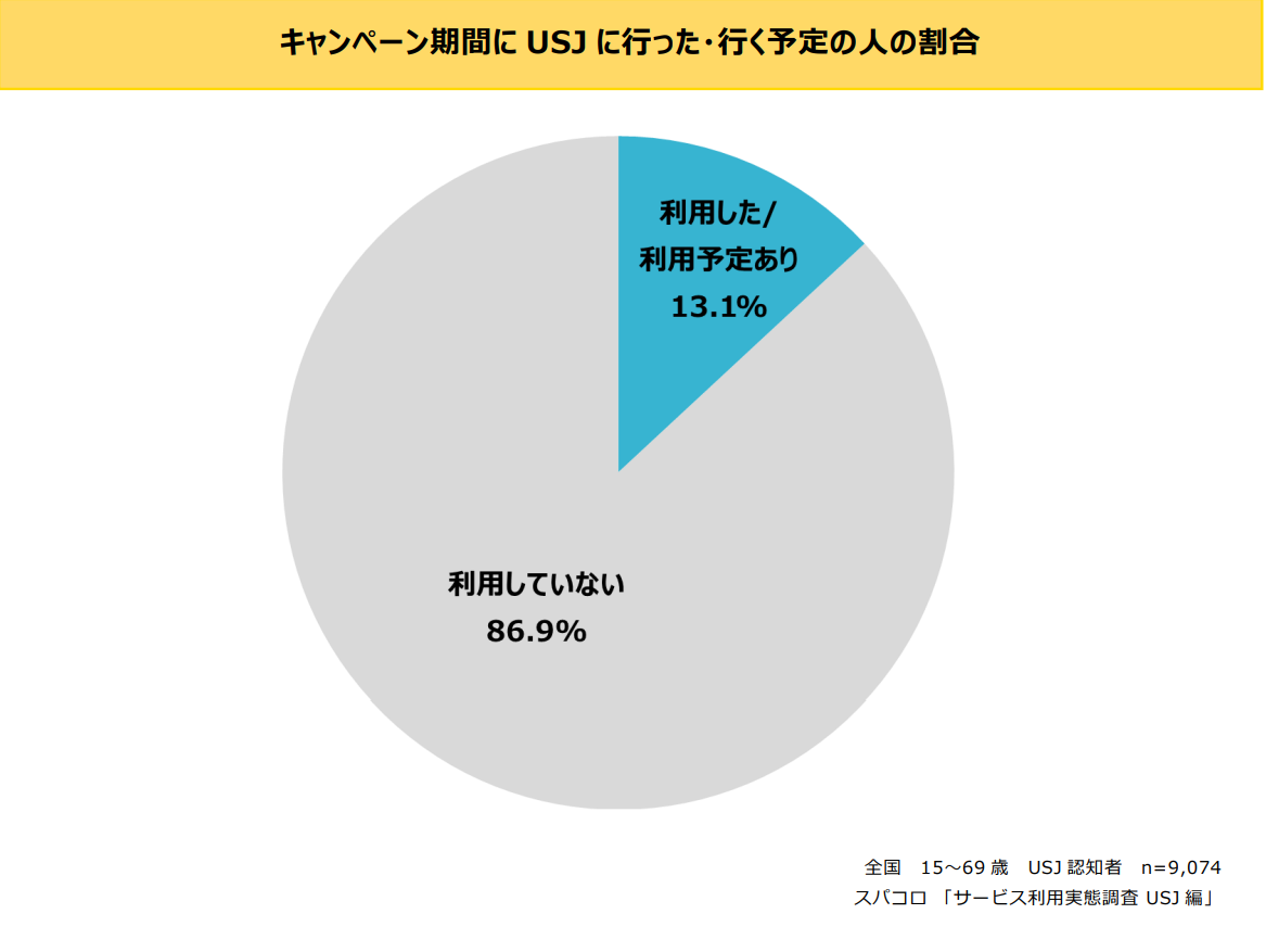 USJ認知者に聞いた、キャンペーンの利用状況では「利用した/利用予定あり」13.1%、「利用していない」86.9%という結果に。認知者の約1割がキャンペーンを利用しUSJを訪れた、または訪れる予定であることがわかる結果となりました。