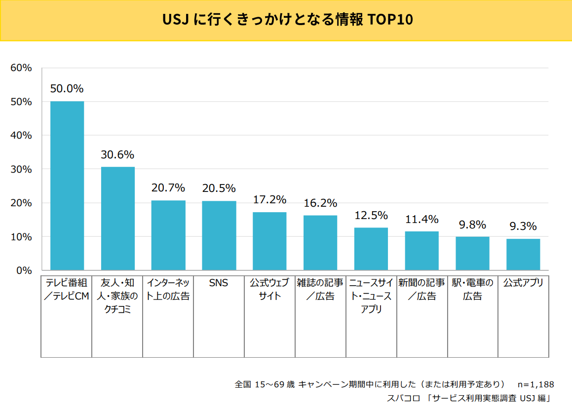 USJに行くきっかけとなる情報は上位から「テレビ番組/テレビCM」(50.0%)、「友人・知人・家族のクチコミ」(30.6%)、「インターネット上の広告」(20.7%)、「SNS」(20.5%)が続いています。1位の「テレビ番組/テレビCM」が他の情報源を大きく引き離しており、約半数がUSJに行くきっかけとして挙げる結果となりました。