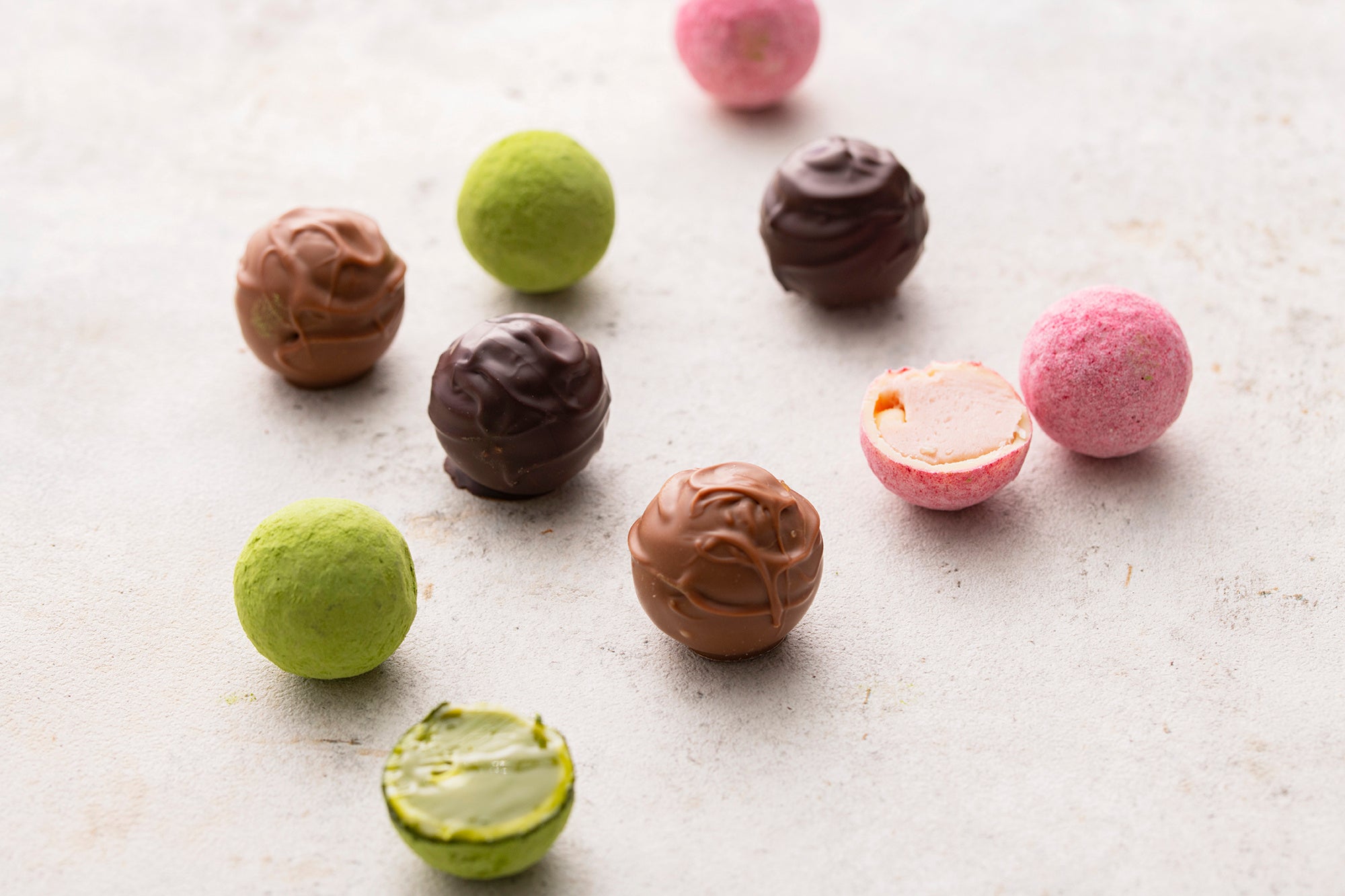 柑橘系の洋酒の香りが立つ「グランマニエ」、ほろ苦い味わいの「ラム」、甘酸っぱく芳醇な「フランボワーズ」、宇治抹茶を使用した「抹茶」の4種のショコラを詰め合わせました。