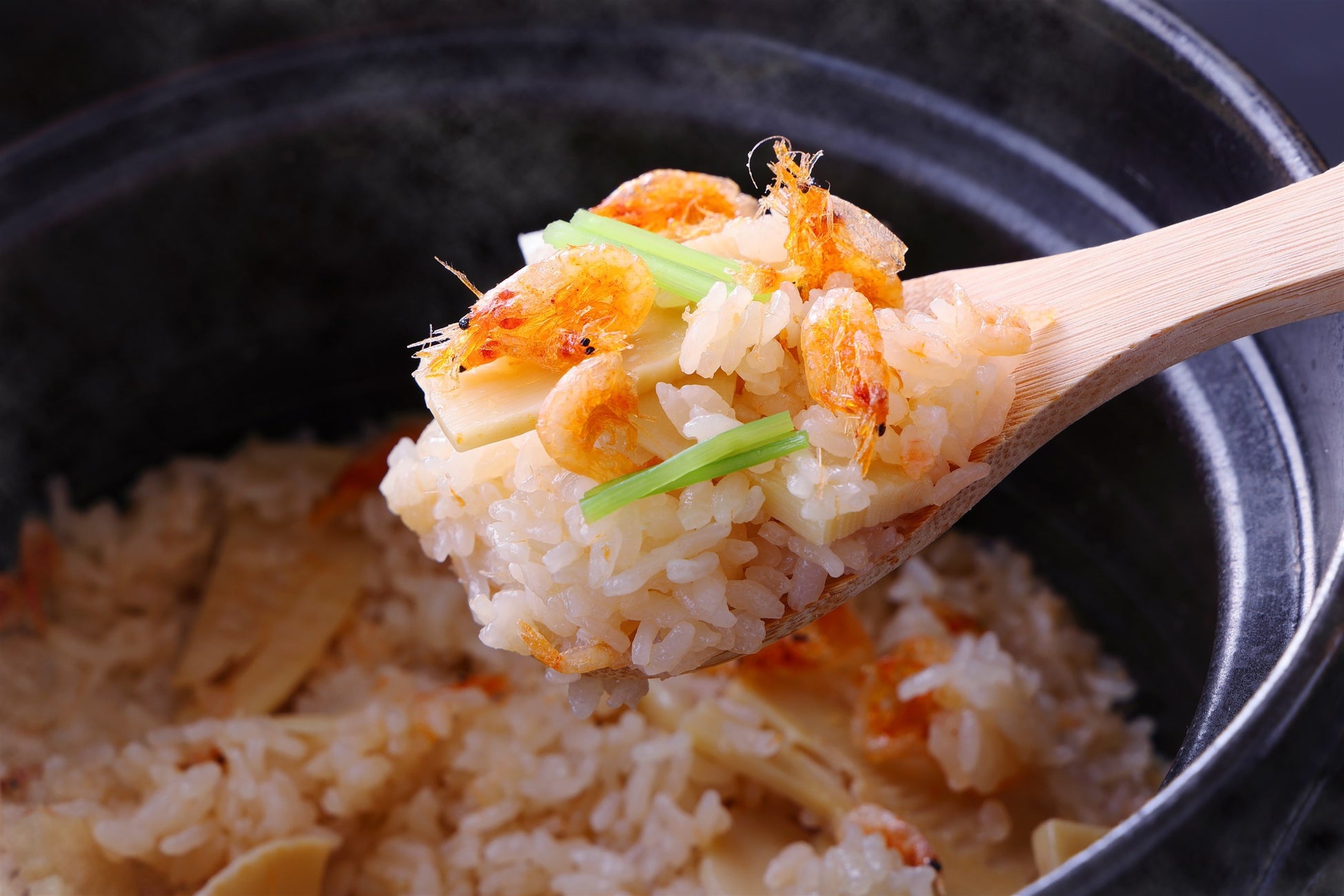 食事の〆(¥14,300コース)に登場するのが土鍋で炊き上げる桜海老と筍の炊き込み御飯。土鍋の蓋を開けると、立ち上がる湯気とともに、桜海老と筍の香りが鼻腔をくすぐります。色鮮やかな御飯はお米の一粒一粒に旨味がしみわたり、思わずお代わりしたくなるほどの味わいです。そんな自慢の炊き込み御飯を、フェア期間中はテイクアウト(1折 ¥2,500)でもご用意いたします。
