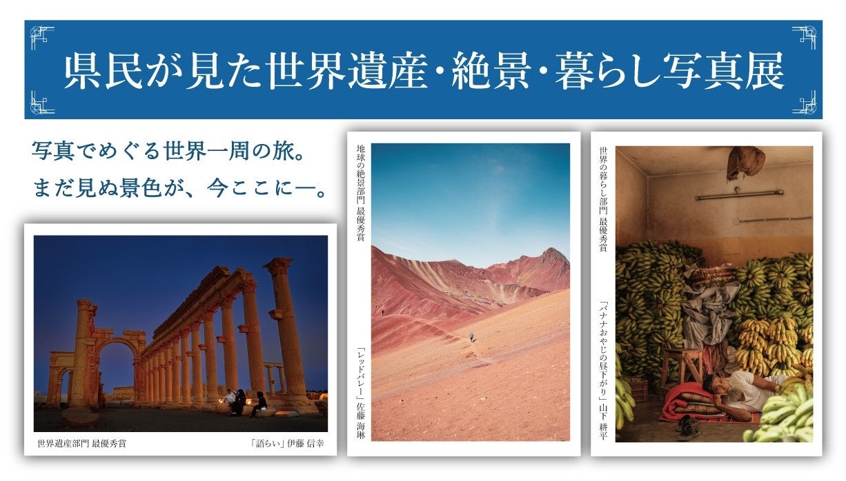 「県民が見た世界遺産・絶景・暮らし写真コンテスト」に応募のあった作品およそ400点の中から、厳正な審査の結果選ばれた入賞作品と優れた作品を、以下3つのテーマで展示します。