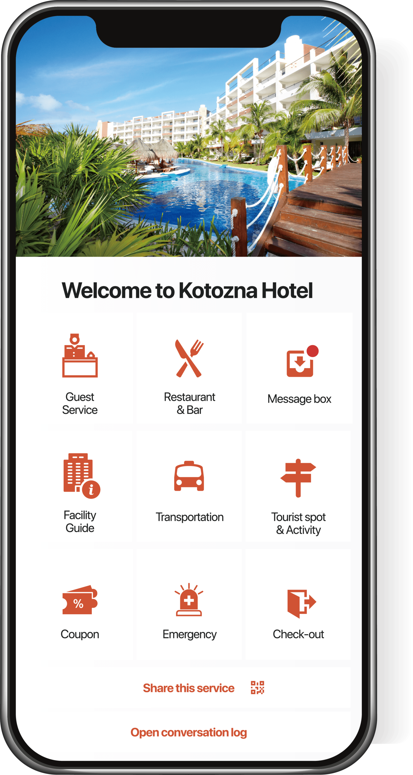 「Kotozna In-room」は、多言語同時翻訳チャットツール「Kotozna Chat」(109言語対応/2022年5月末時点)をベースに新たに開発された、宿泊施設向けコミュニケーションツールです。宿泊客はアプリをダウンロードする必要なく、スマートフォンでQRコード(注1)を読み込むだけで、施設案内や周辺観光情報などが自分の言語で表示され、施設内のどこからでもスタッフと母国語同士でチャットができます。よくある質問にはチャットボットが自動返答することもでき、スタッフは必要な対応に専念できます。ゲストサービス、施設内で利用できるクーポンなど10テーマ・60項目のメニューが提供可能な上、施設のニーズに合わせ、対応項目をカスタマイズできます。本サービスの導入により、宿泊施設スタッフとゲスト間のバーチャルでのコミュニケーションを強化することで、「非対面」「非接触」「ソーシャルディスタンス」「3密回避」、並びに「多言語対応」「業務効率化」「売り上げ拡大」を同時に実現します。