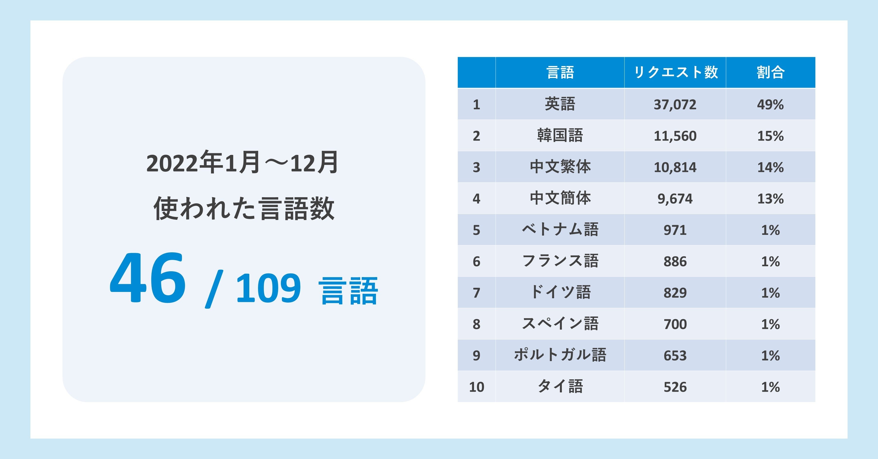 - 2022年の利用言語は、サービス提供している109言語のうち46言語が利用された