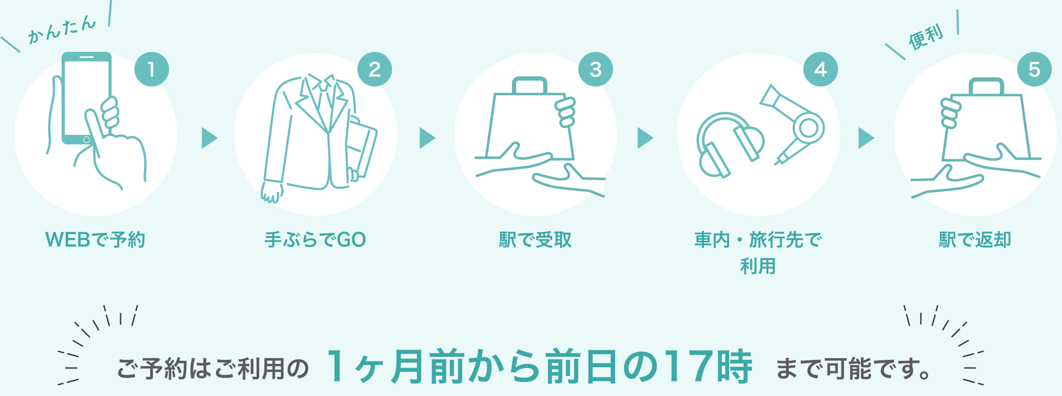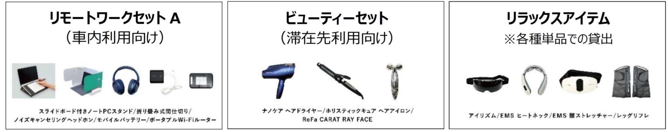 新幹線車内や滞在先でのリモートワークに使えるWi-Fiルーターやモバイルモニターなどのセット、仕事の合間の目や肩などのリフレッシュに使えるリラックスアイテム、および滞在先でのリフレッシュで活用できるヘアアイロンや美顔器などのセットを、駅で借りて駅で返すことができる新しいサービスです。