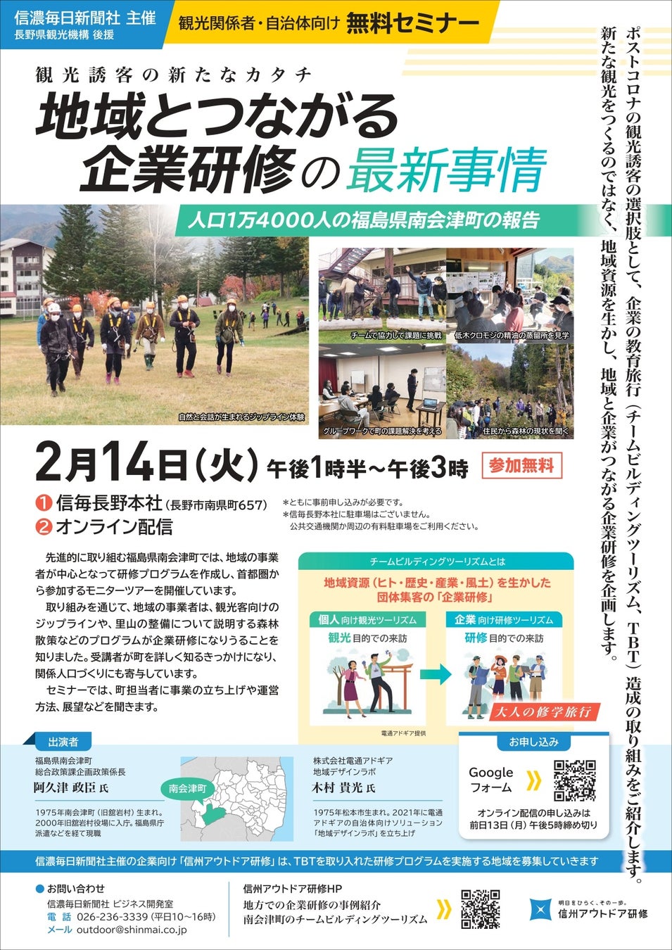 企業研修で地域資源を生かす点は、信濃毎日新聞社主催の企業向け「信州アウトドア研修」と共通しています。セミナーでは同町の担当者らが地域資源を生かした研修プログラムなどを説明します。