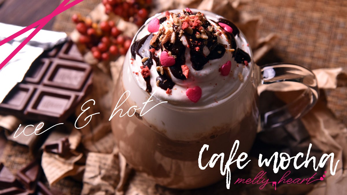 カフェモカの上には生クリーム、チョコレートソース、クラッシュアーモンド、ドライストロベリーと、バレンタインを彩るハートのシュガーをちりばめました。