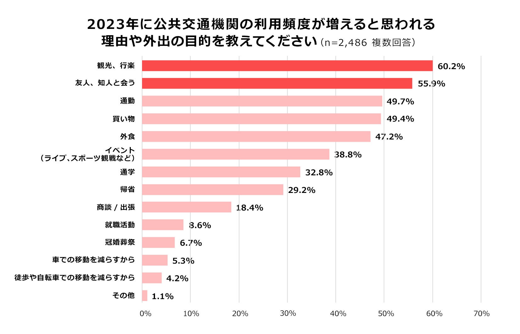 昨年と比べて公共交通機関の利用頻度が増えると思うと回答した人にその理由や目的を聞いたところ、1位「観光、行楽」が60.2%で、2位「友人、知人と会う」が55.9%、3位「通勤」が49.7%となりました。60%以上の人が「観光、行楽」と回答しており、2022年10月より政府が実施している「全国旅行支援」が公共交通機関の利用も後押ししていることが伺えます。