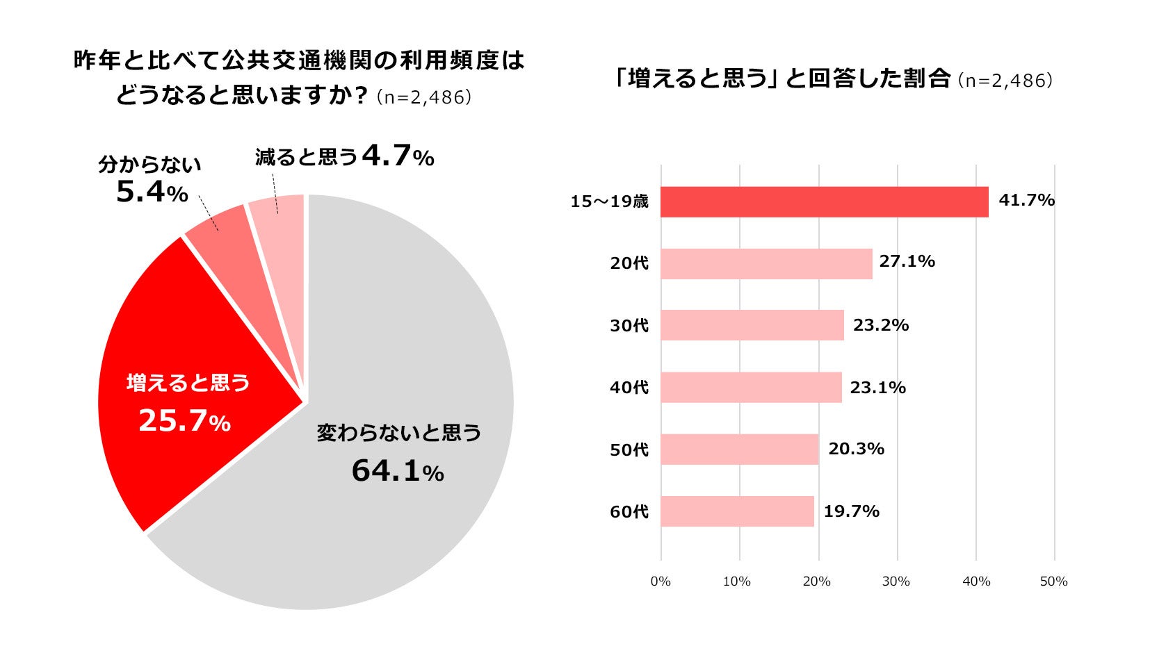 昨年と比べて公共交通機関の利用頻度がどう変わるか見込みを聞いたところ、25.7%が「増えると思う」と回答しました。その割合を年代別に集計すると15~19歳が41.7%と最も高く、20代は27.1%、30代は23.2%、40代は23.1%、50代は20.3%、60代は19.7%と年代が上がるにつれ割合が低くなる結果となりました。