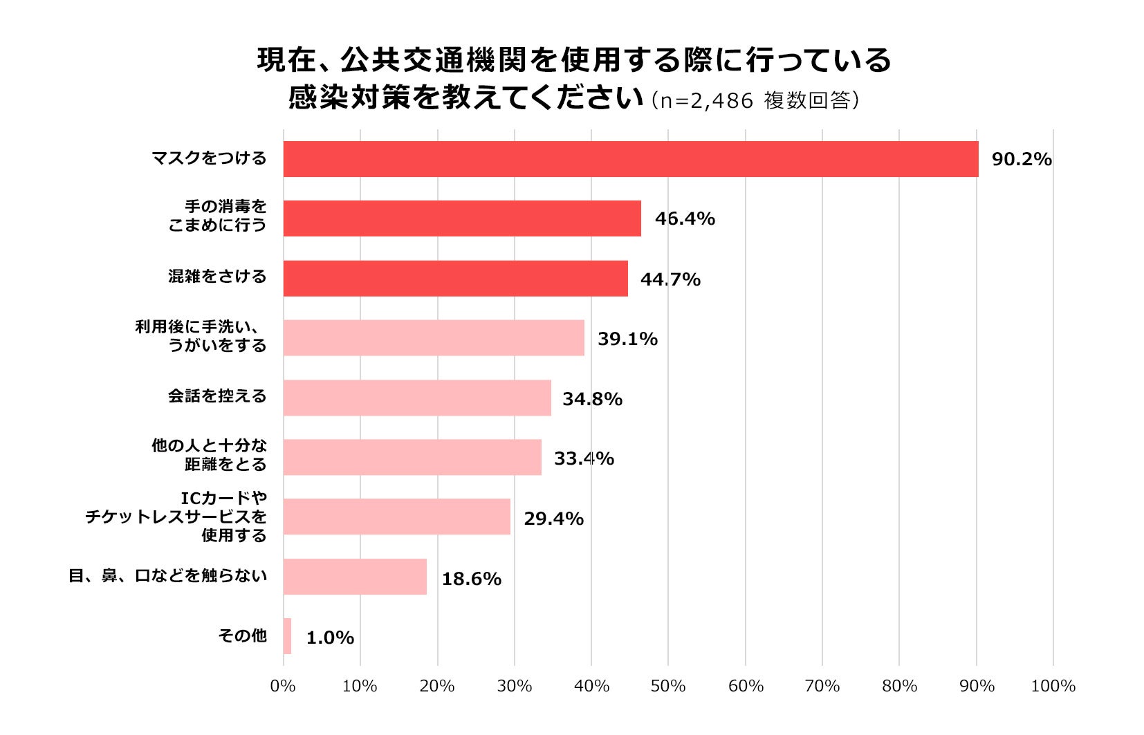 コロナ以降新しい生活様式として定着したマスクの着用ですが、公共交通機関の利用時も90.2%が感染対策として実施していました。また、それ以外にも半数近くの人が「手の消毒をこまめに行う」「混雑をさける」を選択しており、複数の感染対策を行いリスクを低減していることが分かりました。
