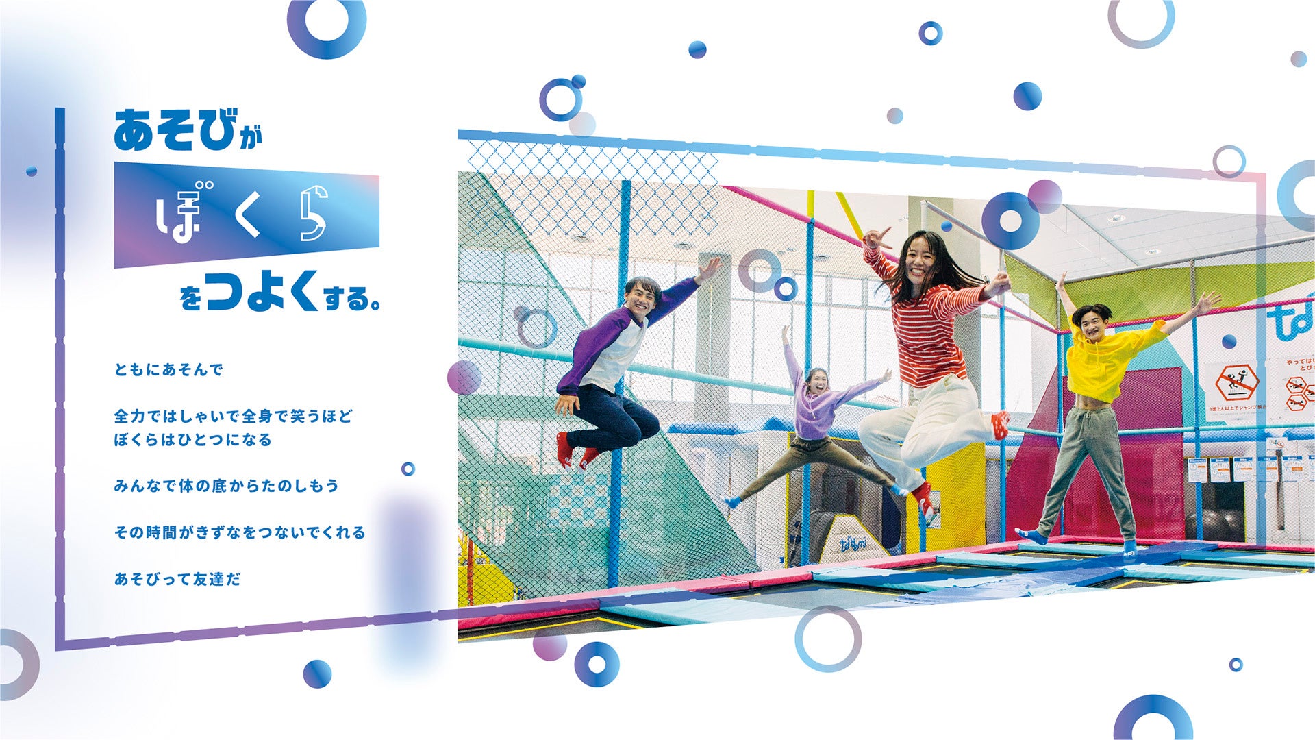 「トランポリン」「クライミングウォール」「ロープウォーク」など人気のアクティビティを取りそろえた本格的な屋内アスレチック施設です。現在国内4か所で展開中で、1号店のイオンモール幕張新都心店の開業以来延べ200万人のお客さまにご来場いただいています※1。『トンデミ』は、国内の屋内型アスレチック業態の第一人者として、今後も積極的に世界中から新奇性のあるアクティビティを導入し、ご来場いただいたお客さまに“ここにしかない”さらに新しい体験価値を提供していきます。