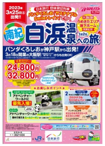 アドベンチャーワールド(和歌山県白浜町)とJR西日本がコラボし2020年7月より運行している、SDGs(持続可能な開発目標)をテーマにした『パンダくろしお「サステナブル Smile トレイン」』を貸切運行する旅行「パンダくろしお『サステナブル Smile トレイン』で行く南紀白浜温泉への旅」をJR西日本、株式会社日本旅行と共同で実施いたします。
