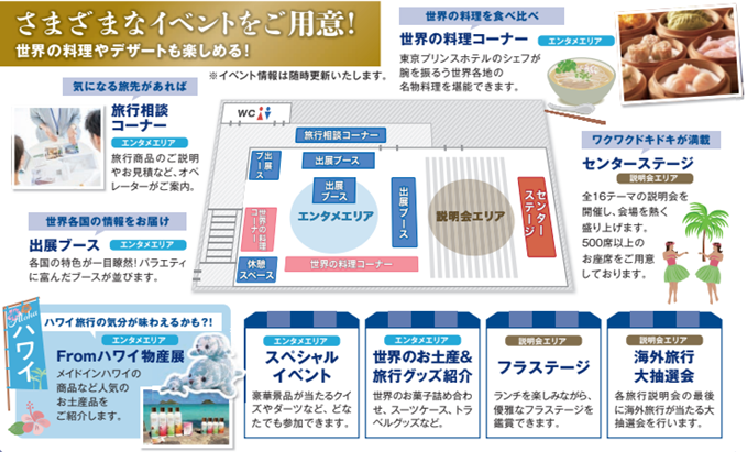 昨年からようやく再開した海外旅行。延期や未定となっていたハネムーンや卒業旅行、家族旅行など、再び海外旅行を心待ちにされている皆様に向けて、来て、見て、聴いて、食べて、体験して、楽しみながら海外旅行の魅力を再発見いただけるイベントとして開催いたします。政府観光局や航空会社、専門家による各国の最新の情報や、説明会のテーマごとに海外旅行が当たる大抽選会、東京プリンスホテルのシェフが腕を振るう世界の名物料理をお楽しみいただける、海外旅行の“ワクワク”を体験いただける無料イベントとなっております。
