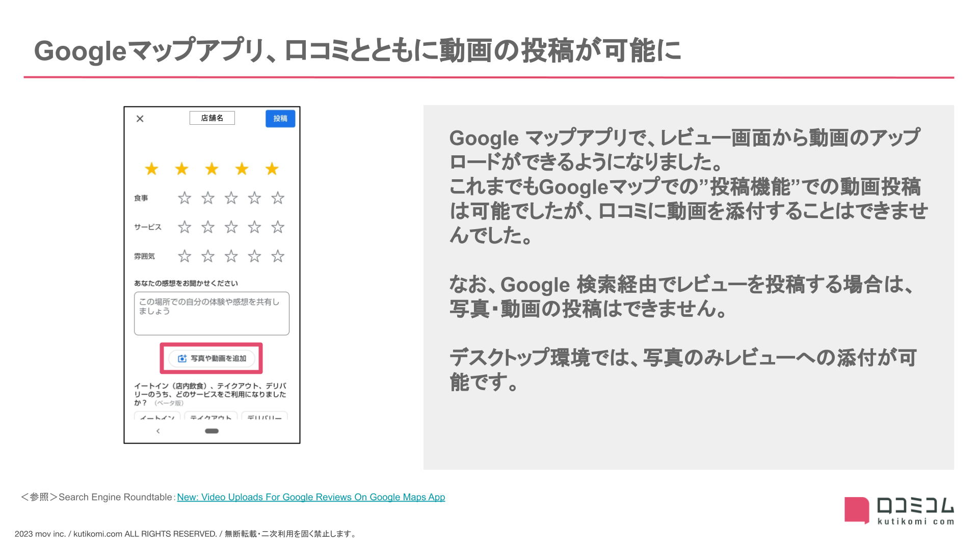 - Google マップアプリのレビュー投稿画面から動画アップロードが可能に