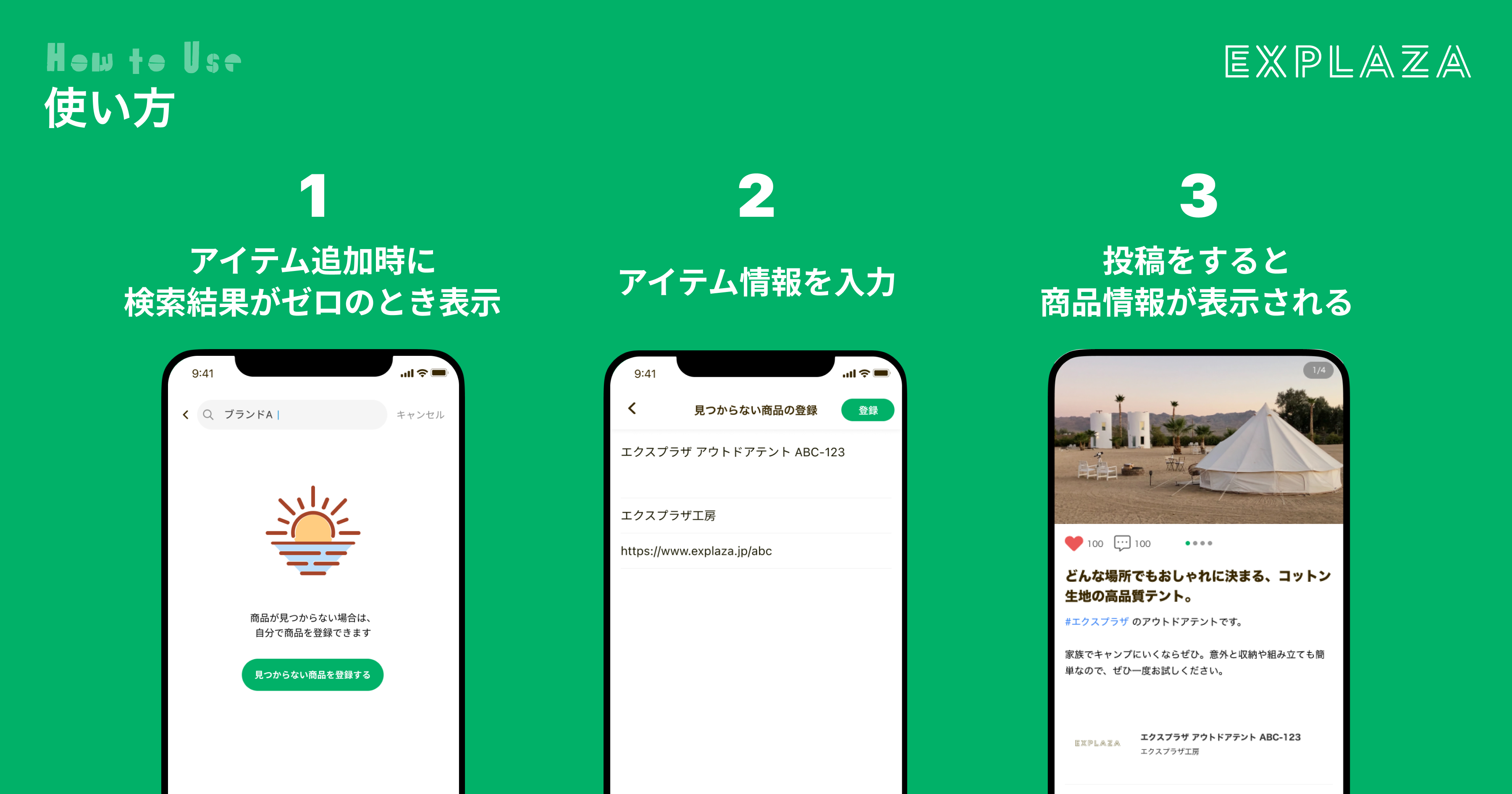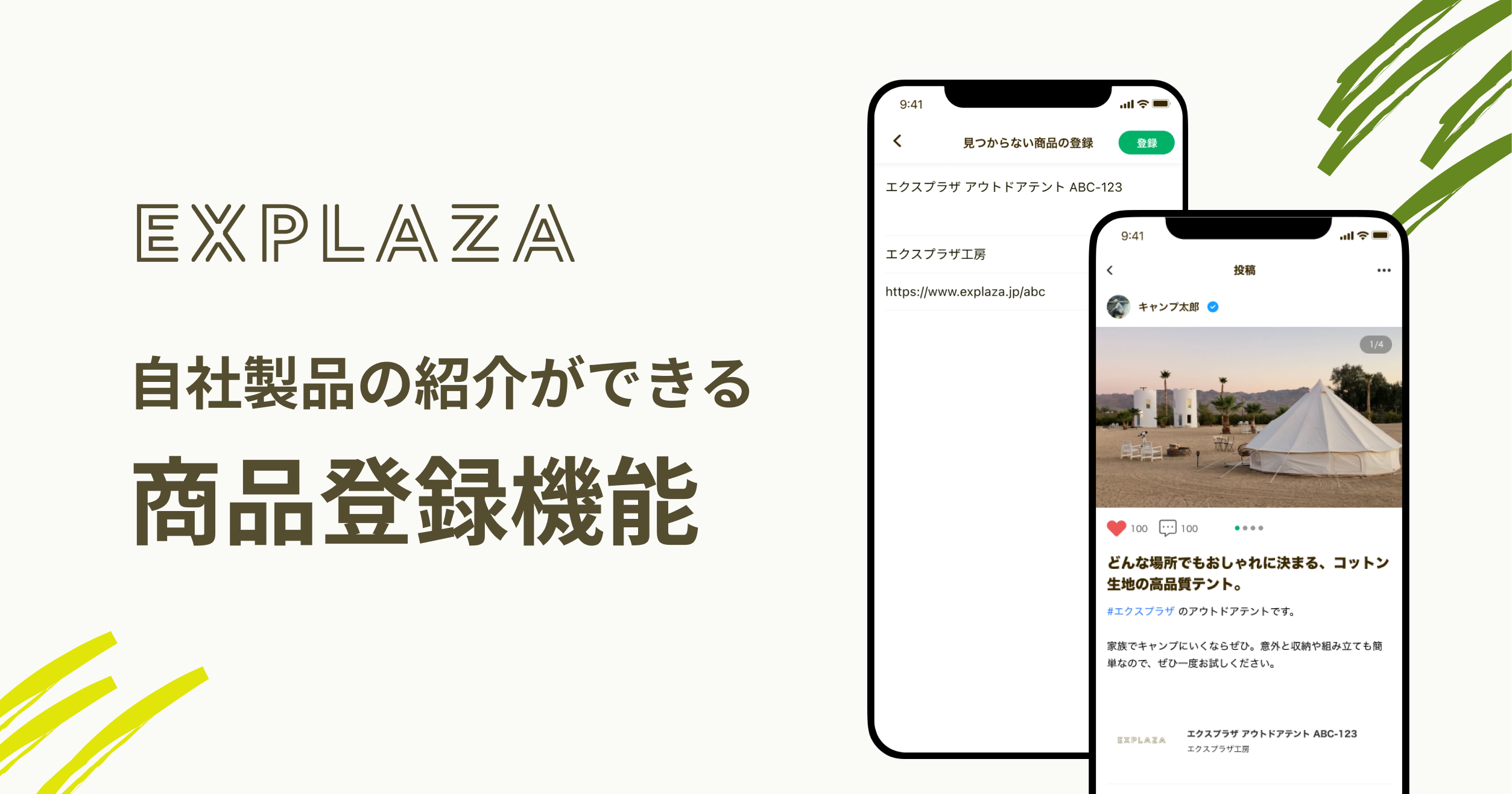 株式会社エクスプラザ(本社:東京都渋谷区、代表取締役CEO 高橋一生、以下エクスプラザ)は、アウトドアギアの口コミアプリ「EXPLAZA」において、楽天市場やYahoo!ショッピングにない商品も口コミとして投稿できる「商品登録機能」をリリースしました。