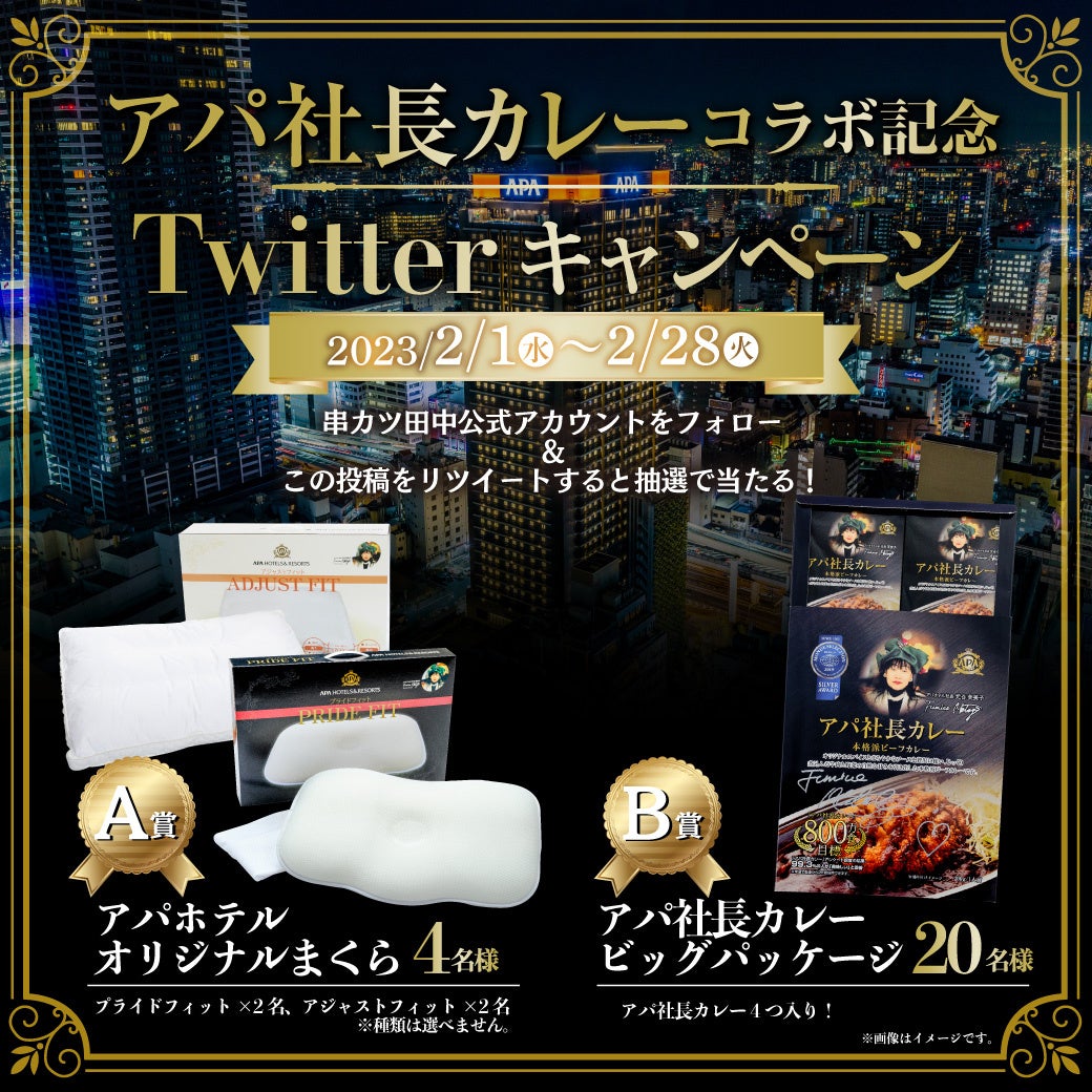 串カツ田中公式Twitterアカウントをフォローして、キャンペーン投稿をリツイートすると、抽選でA賞もしくはB賞の賞品をプレゼント