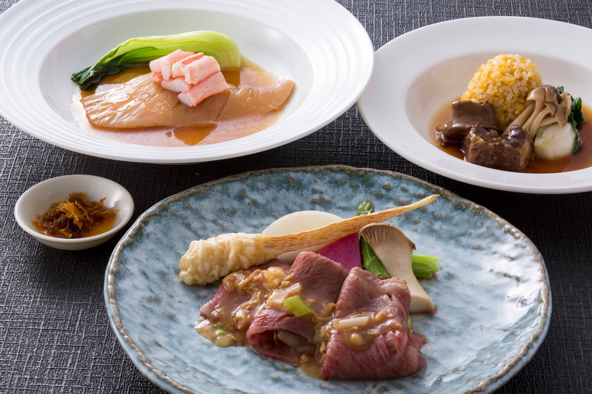 メインは、神戸ビーフロース薄切り肉の煎り焼き。絶妙に火入れした神戸ビーフに自家製X O醤ソースが絡んだとろける美味しさは至高の極み。神戸牛スネ肉のあんかけチャーハンのほか、紅ズワイ蟹入りフカヒレ煮込みなど豪華ラインナップ。
