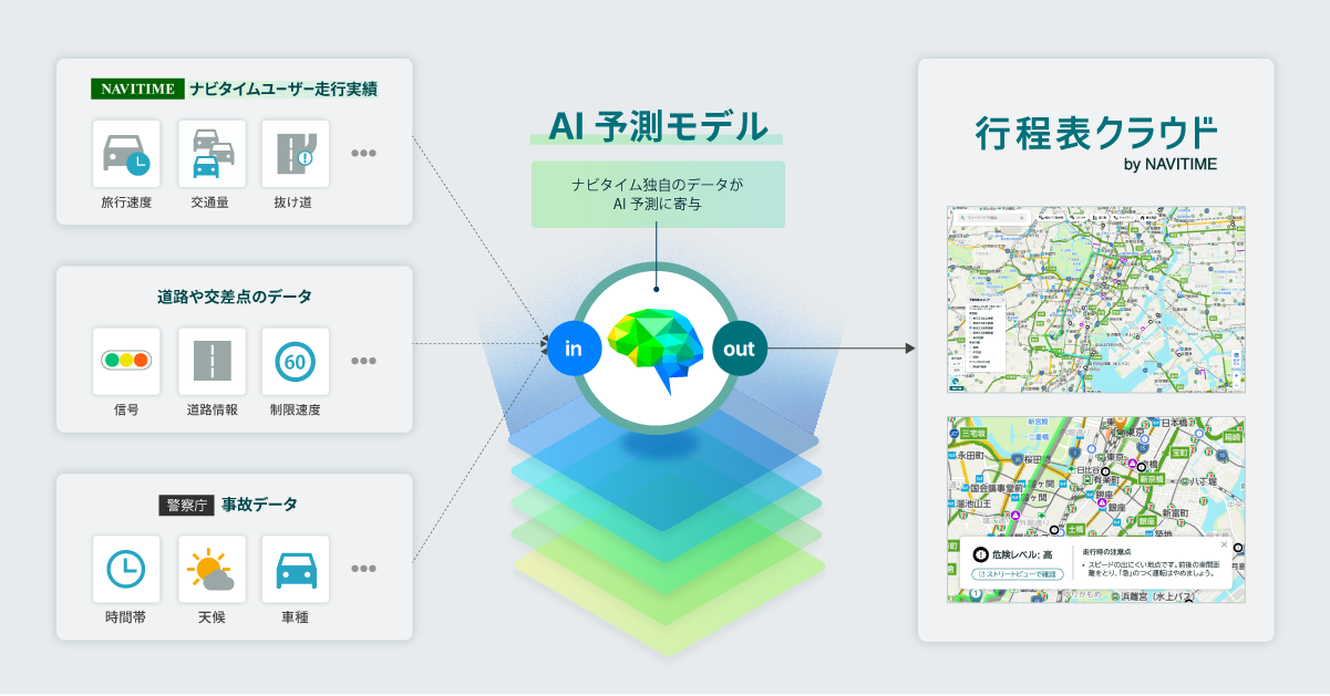 当社が提供する『カーナビタイム』や『NAVITIMEドライブサポーター』などのカーナビアプリで同意を得たユーザーから取得できるプローブデータ(ナビタイムユーザー走行実績)、信号・道路情報・制限速度等(道路や交差点のデータ)、時間帯・天候・車種等といった警視庁の「交通事故統計情報のオープンデータ」(警視庁 事故データ)を用いて分析し、交通量あたりの事故リスクをAI(機械学習)で予測しています。