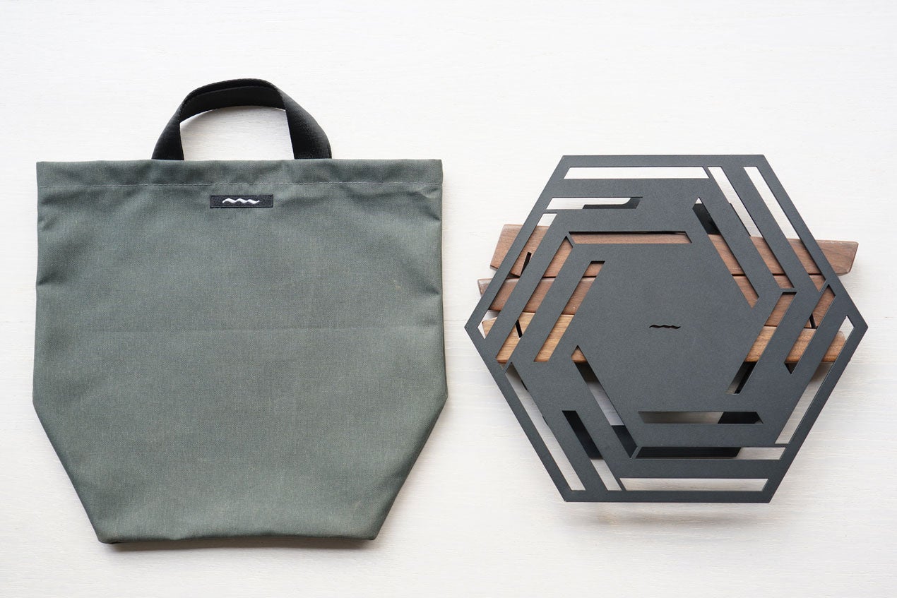 三本の脚と、六角形の天板。そして、自然に抱かれ、雄大な山麓を臨みながら、焚き火と共にあるチルタイムを過ごすテーブルであること。そんなイメージから名付けました。