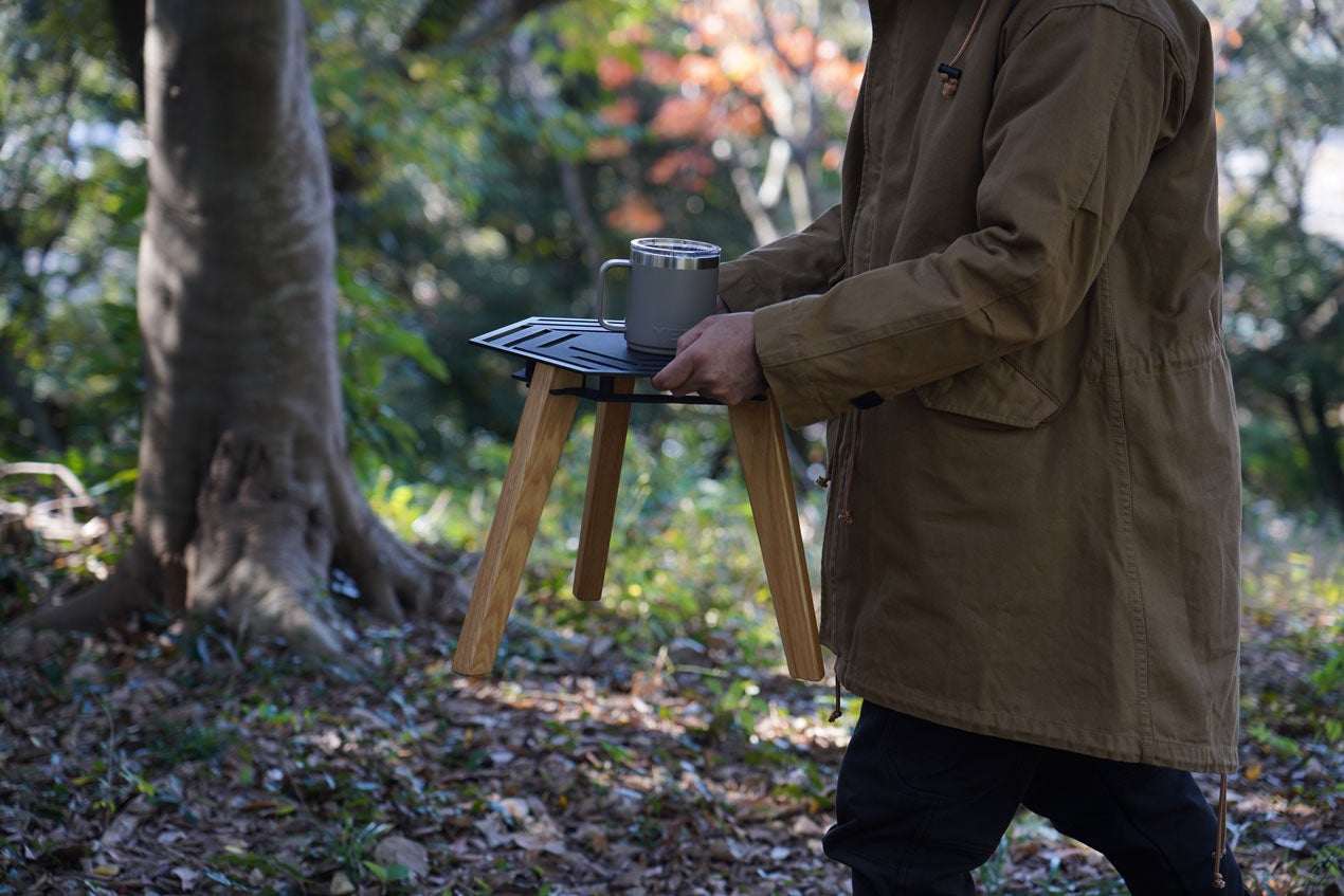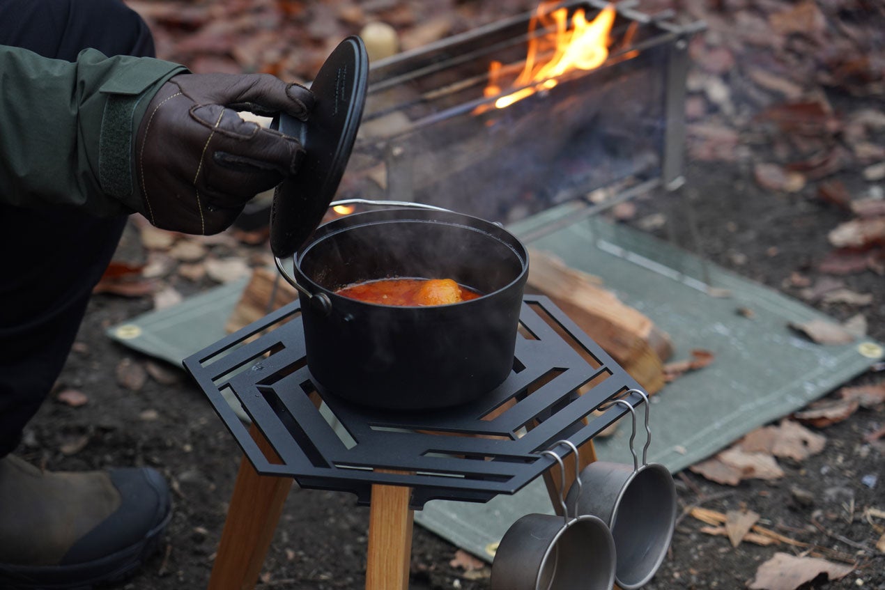 天板は厚さ3mmの金属製なので、焚き火調理で高温になったダッチオーブンやスキレットなどを「ちょい置き」したり、そのままミニマムな食卓として利用できます。