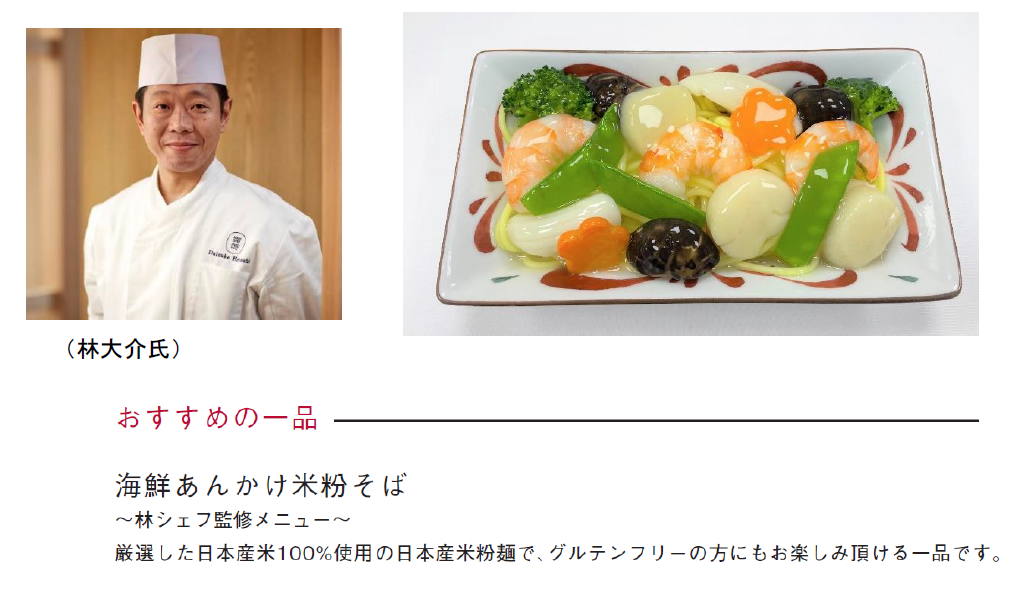 2023年2月1日~28日までの間、JALのロンドン発羽田行のファーストクラスおよびビジネスクラスにおいて、日本製米粉麺を使ったメニュー「海鮮あんかけ米粉そば」を提供します。