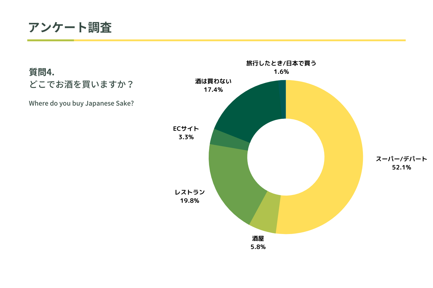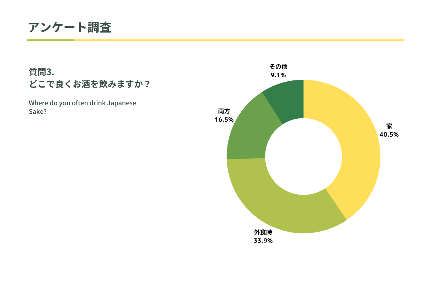 家が40.5%とあり、日本酒を買って家で飲む人が一定数いるということが分かりました。