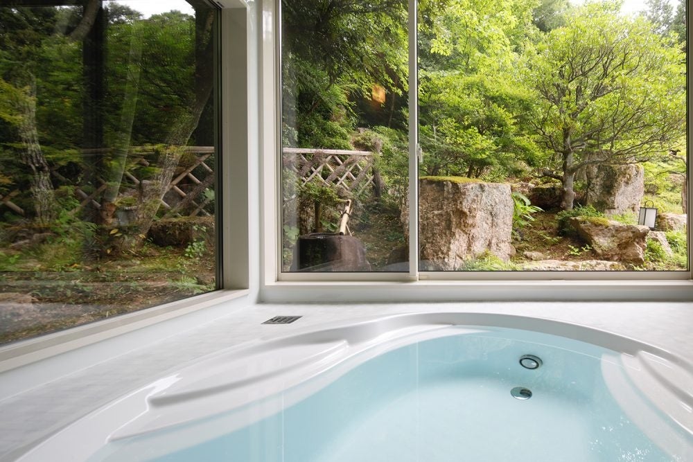 部屋からもテラス席からも眺められる庭園が特徴の宿。マイクロバブル方式のジャグジーバスで四季折々の庭園の表情を楽しみながら森林温浴体験を楽しめます。