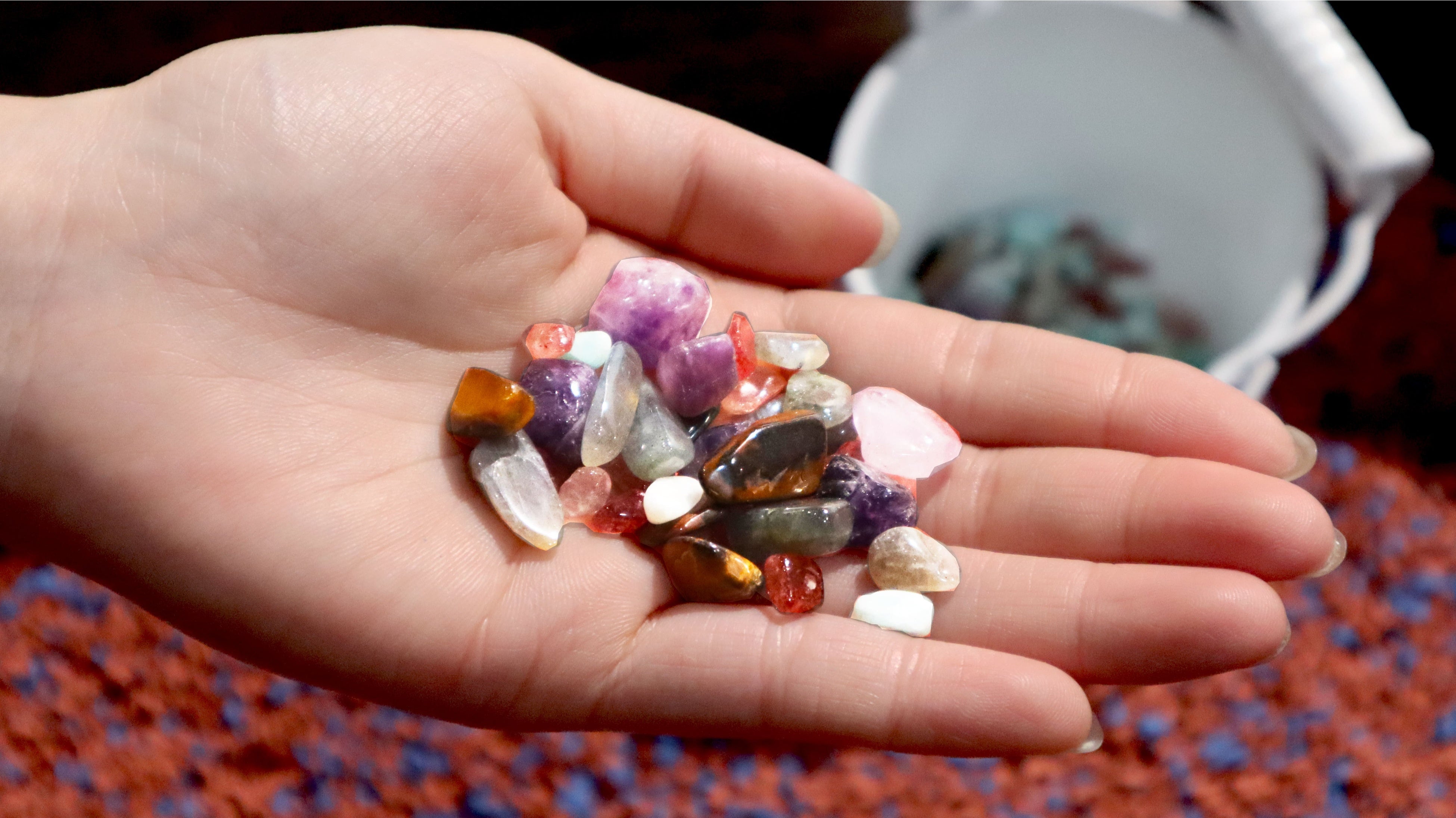 水晶、アメジスト、ラブラドライトなど、約10種類の大小さまざまな本物の宝石が手に入ります。